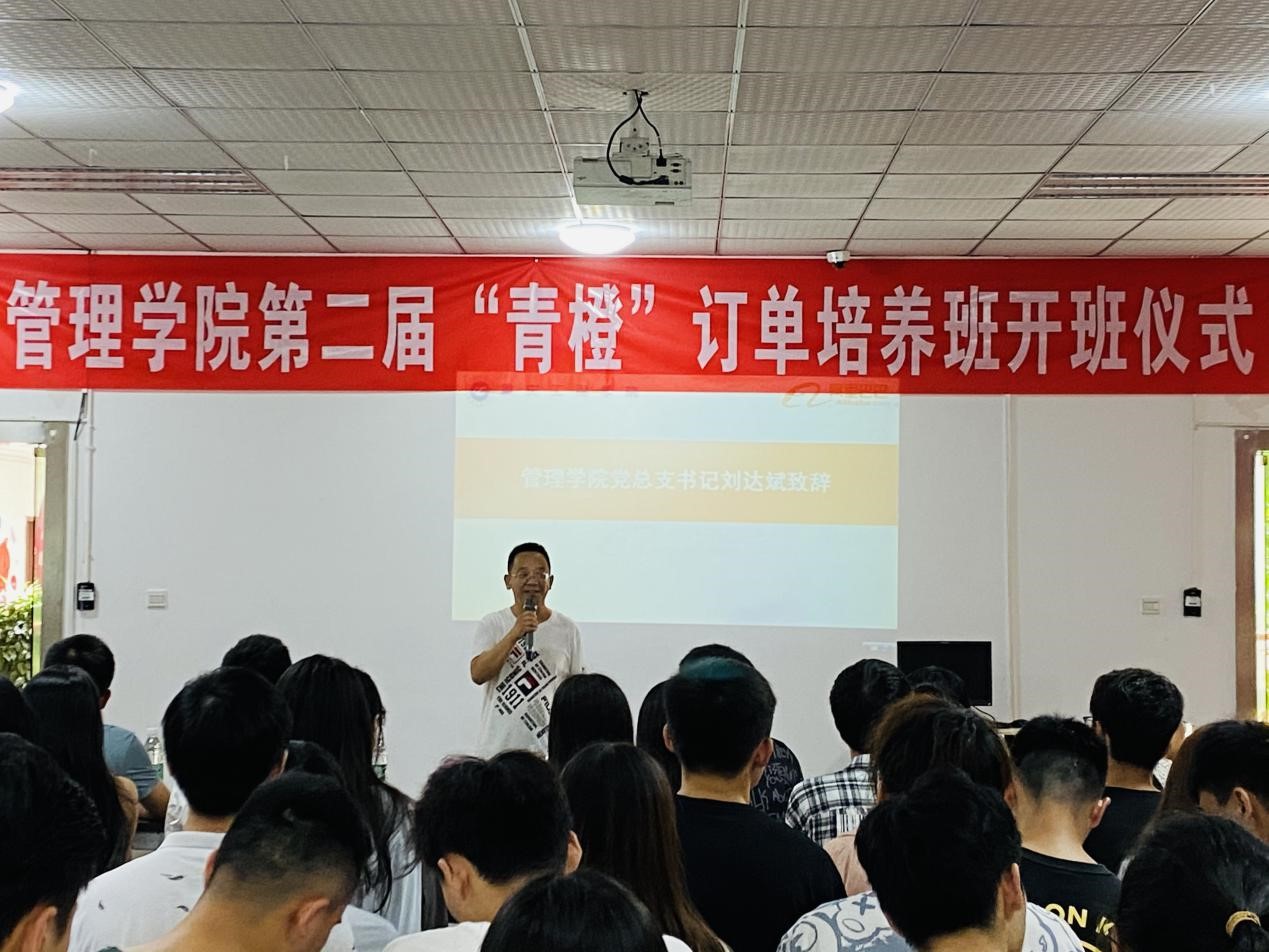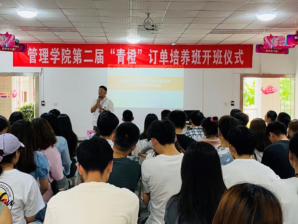 2021年7月7日,管理学院在实习楼303室隆重举行了第二届“青橙”订单班开班仪式。参与本次会议的领导有阿里巴巴集团客户体验事业群高级运营专家李岩和高级业务专家陈建松,管理学院党总支书记刘达斌,电子商务系主任宋超,阿里实训基地负责人曾霞老师以及管理学院的老师们,会议由第二届“青橙”订单班班主任卫莉老师主持。