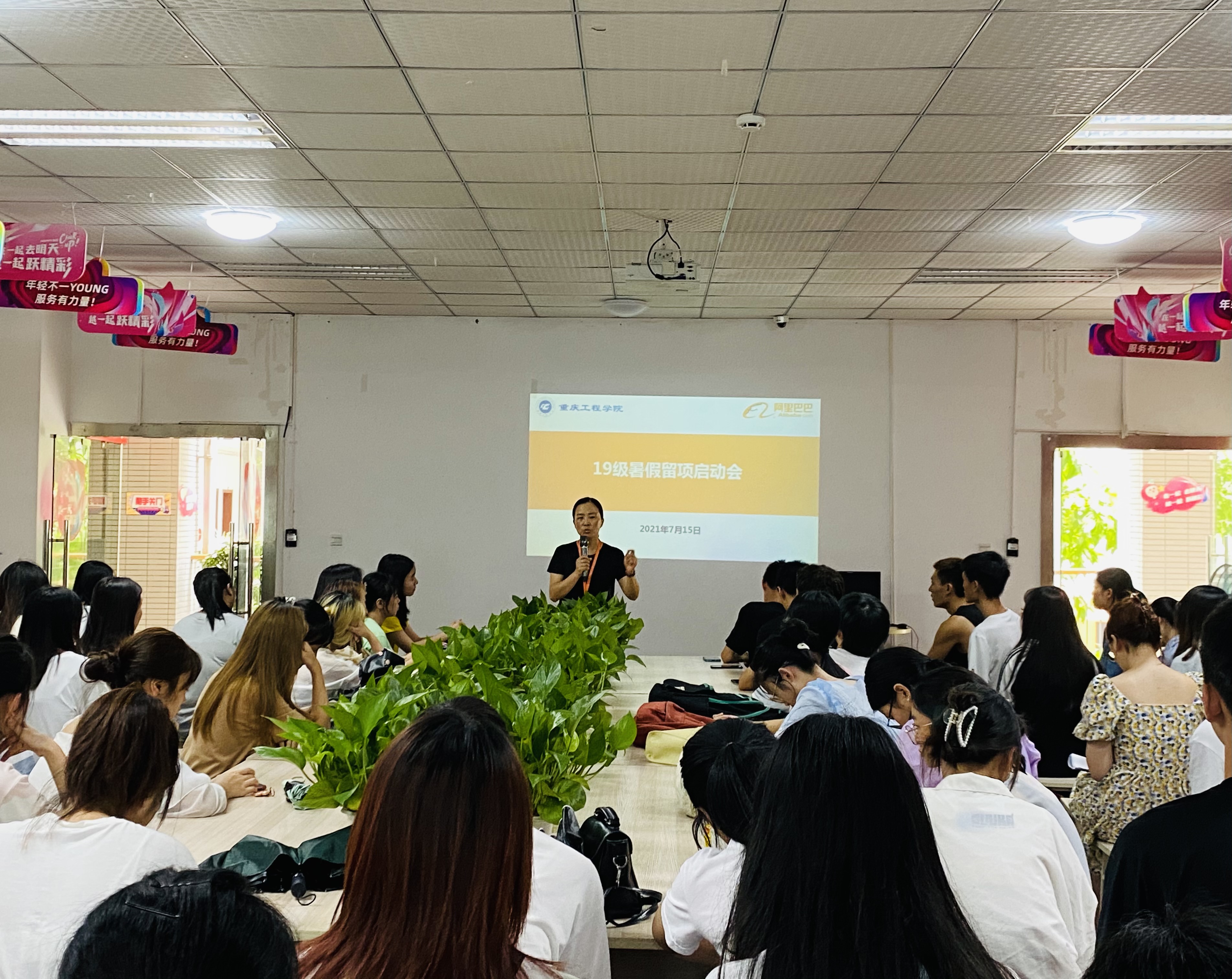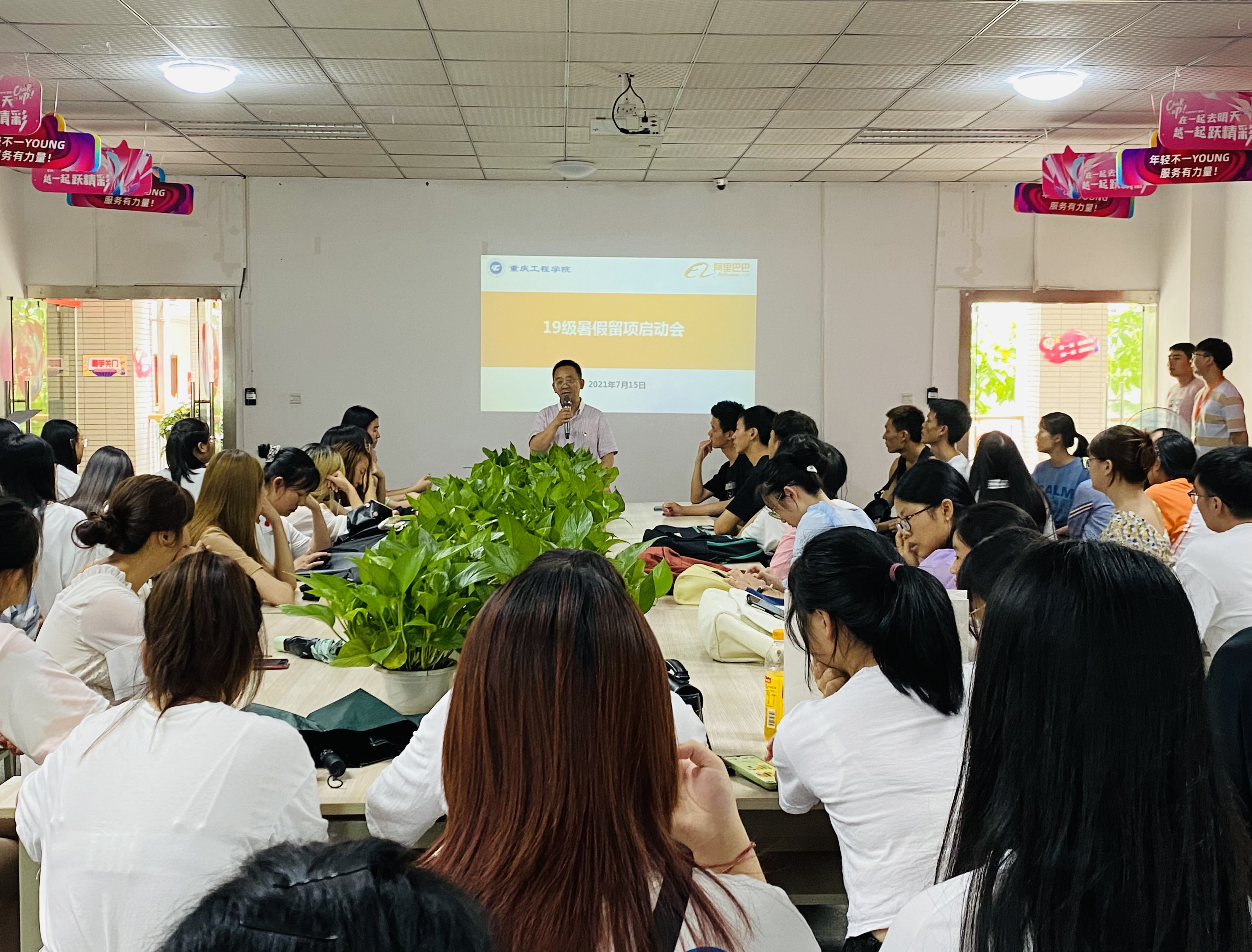阿里巴巴新零售人才孵化基地于2021年7月15日12点20分在实习楼303室召开了19级电子商务专业暑期留项启动会,参与本次启动会的领导有重庆工程学院管理学院党总支书记刘达斌,阿里实训基地负责人曾霞,阿里实训班主任卫莉,赵鹏飞,还有本次自愿报名暑假期间留在项目内实训的79名19级电子商务专业的同学们。