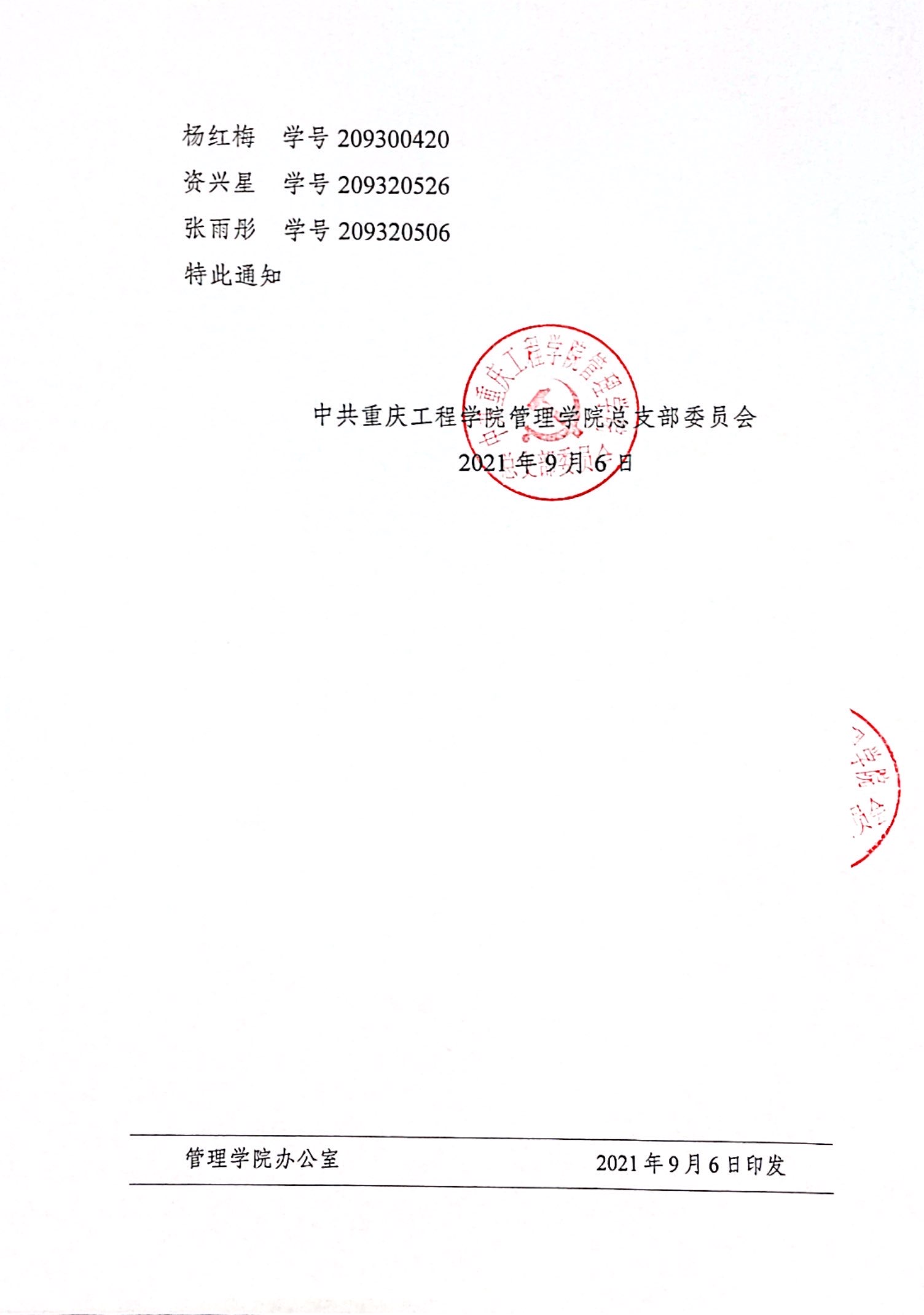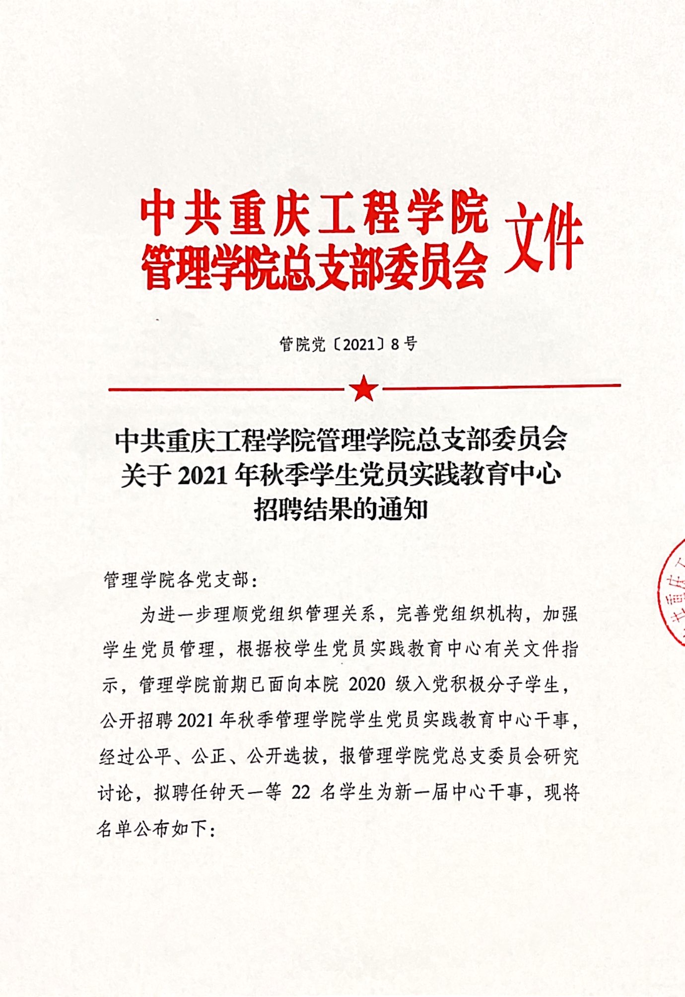 管院党〔2021〕8号 关于2021年秋季学生党员实践教育中心招聘结果的通知