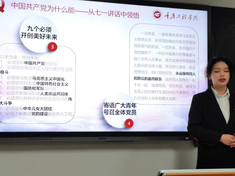 8名学生预备党员通过马克思主义中国化的具体理论成果、伟岸的革命英雄先烈、崇高的建党精神、选贤任能的科学机制等具体内容,以生动例子,讲述了中国共产党为什么“能”。同时,他们以时间为轴向2020级同学们讲述了中国是如何完成从站起来到富起来再到强起来的伟大飞跃,如何创造了让世界惊叹的“中国奇迹”,以此来激励学弟学妹们要行而不辍,不负众望。