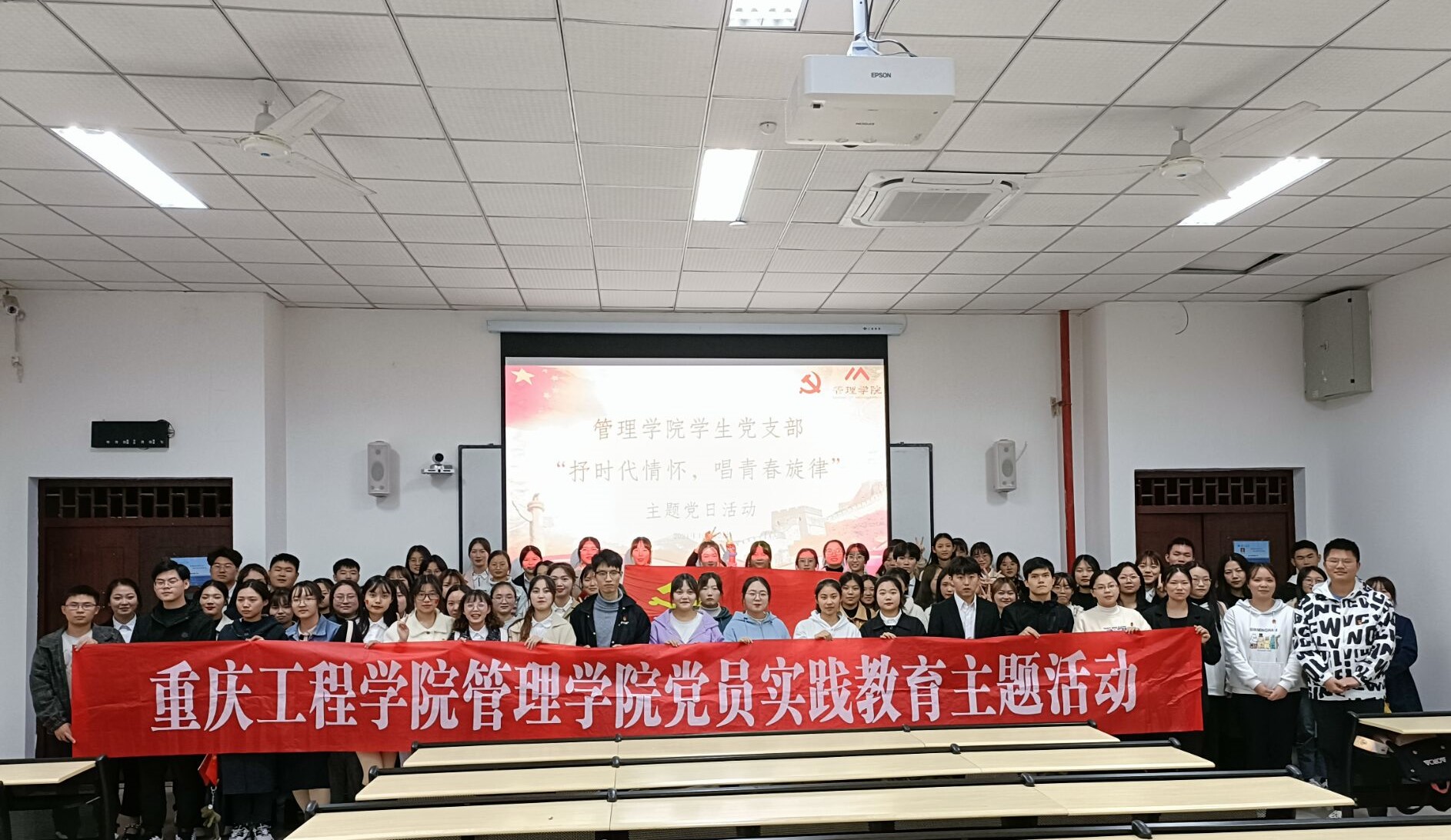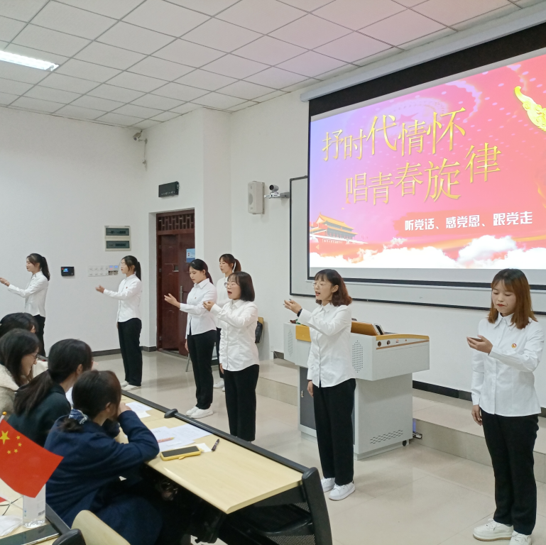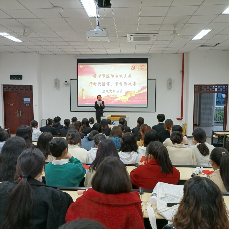 礼赞新中国,讴歌新时代。为深入开展红色精神文化学习教育,加强广大青年学生的思想引领和价值导航作用,管理学院学生党支部于2021年10月22日18:00在6204教室开展了“抒时代情怀,唱青春旋律”主题党日活动。此次活动由管理学院学生党员实践教育中心教育培训部干事陈绍珊主持,管理学院各学生党支部共有110余名同学参加。