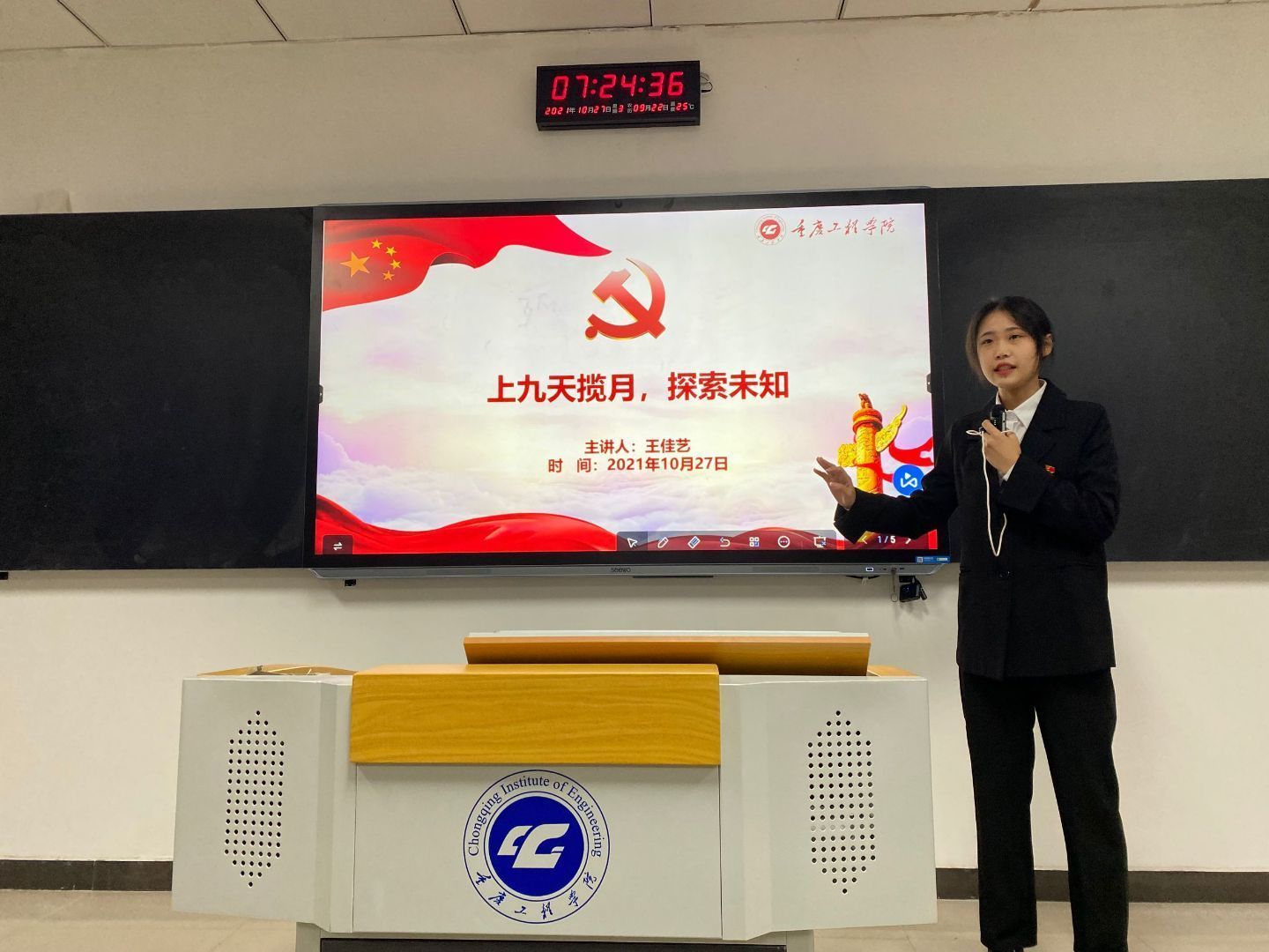 为引导广大同学关注时事政治,心系党和国家的前途和命运,坚持正确的政治方向引领,2021年10月27日7:20,管理学院学生党支部在第六教学楼开展了“大学生微党课”党员演讲进班级活动之时政热点。8名19级预备党员走进晨课课堂,以时政热点为主题,为20级同学们进行宣讲。