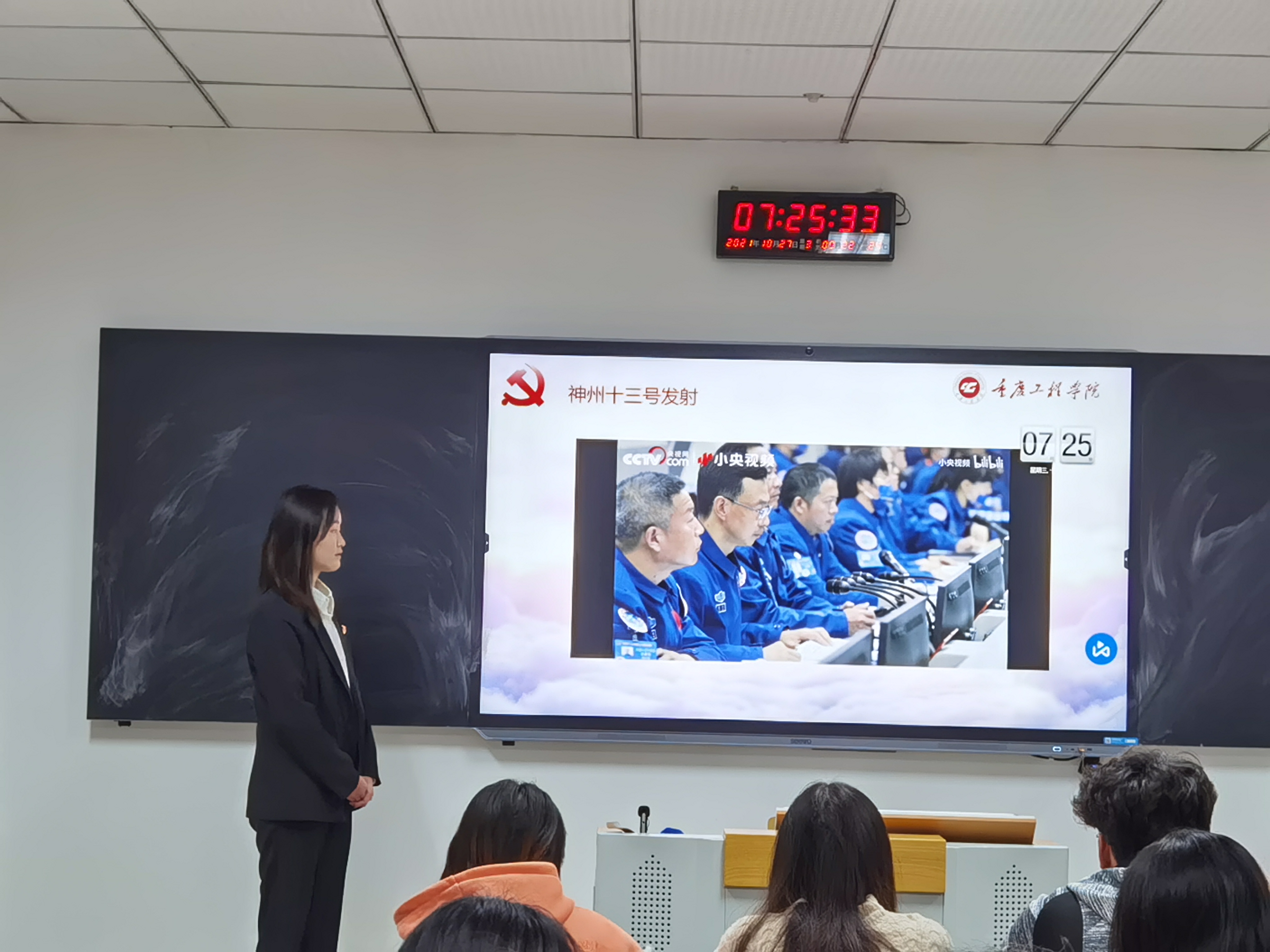 8名预备党员就自身的了解,结合国内外近期发生的事情向同学们进行了时政热点的宣讲,并与同学们分享了自己的感想。其中,王佳艺同学围绕中国的航天科技展开深入的交流。她讲到,“神五”作为中国第一艘载人飞船,它的成功发射与返回树立了一座航天事业的里程碑,2003年,杨利伟同志也载着中华民族的梦想飞上九天揽月。最后,王佳艺同学希望同学们珍惜大学时光,青春向党,奋斗在新时代的浪潮中,展现新气象、做出新贡献。