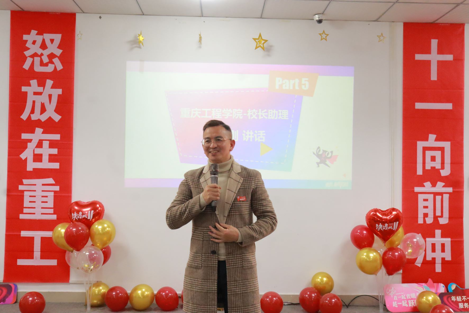大会最后,重庆工程学院校长助理简玉刚致辞,他表示双十一是基地水平更甚至是个人能力的综合大检验。成功的团队,离不开各位同学们的大力支持,更需要各位同学们的精诚团结,齐心奋战。