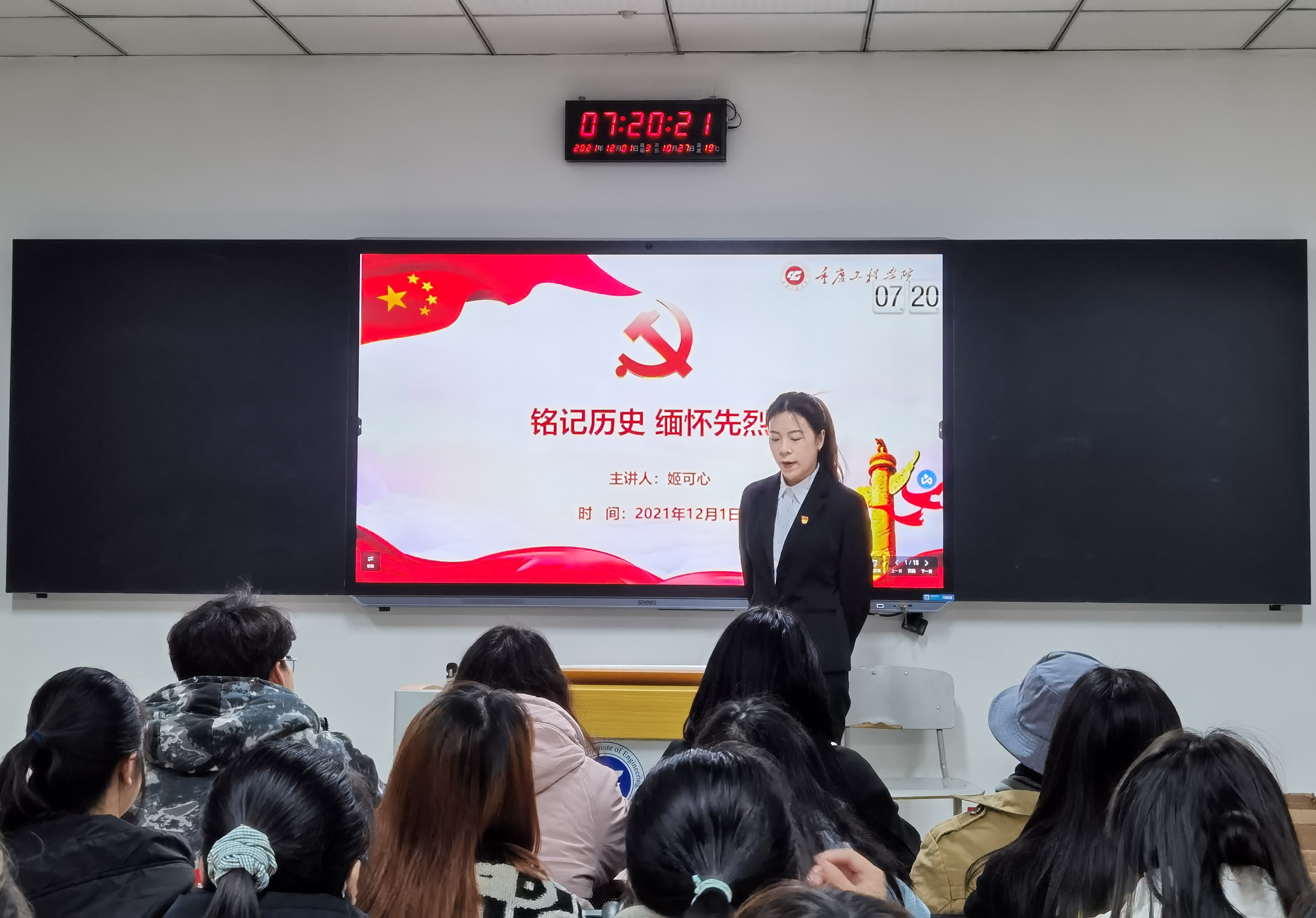 为引导同学们铭记历史,缅怀先烈,珍爱和平,坚定理想信念,激发爱国主义思想,2021年12月1日7:20,管理学院学生党支部在第六教学楼开展了“大学生微党课”党员演讲进班级活动之“铭记历史,缅怀先烈”。8名2019级预备党员走进晨课课堂,为2020级同学们进行宣讲。