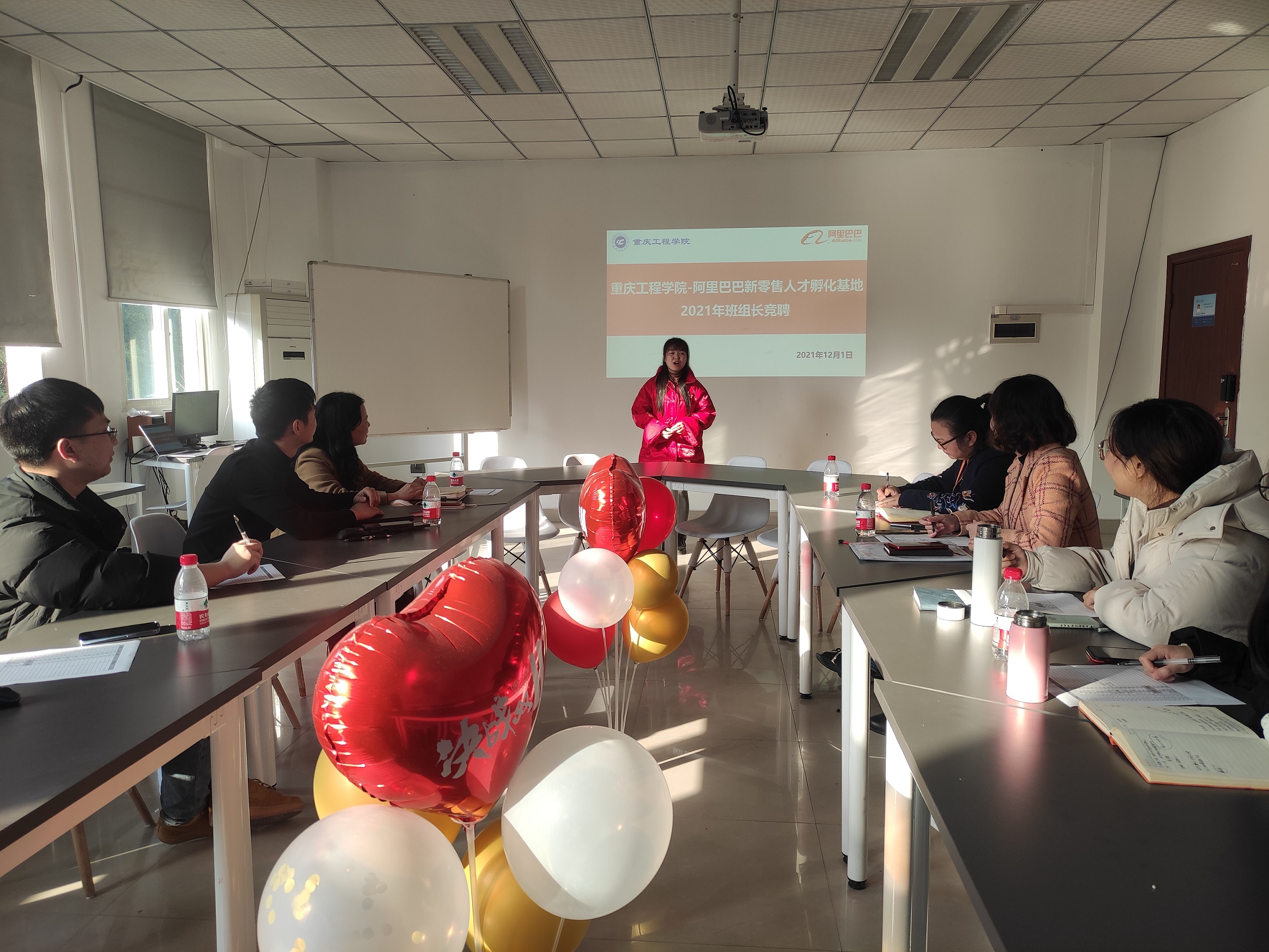 2021年12月1日,重庆工程学院阿里巴巴新零售人才孵化基地“2021年班组长竞聘”活动在实习楼304举行。参与本次竞聘活动的评委有阿里巴巴新零售人才孵化基地项目负责人曾霞,重庆工程学院阿里巴巴新零售人才孵化基地实训班主任芦亚柯、卫莉、赵鹏飞,阿里基地质培主管李卿以及阿里基地职能岗等相关人员。