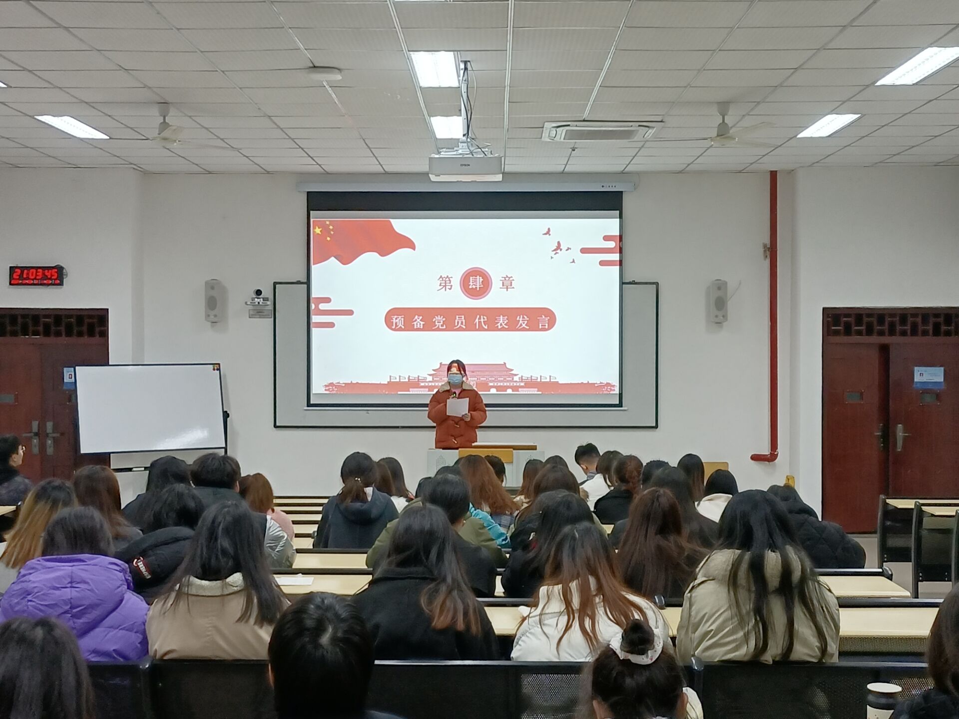 活动伊始,主持人田甜简述了本学期学生党建活动的内容,并播放视频带领大家回顾了这一学期来的“七培四创”学习成果。视频,虽寥寥几分钟,却深刻传达出“一个党员就是一面旗帜”的涵义,鞭策同学们在流逝的匆匆时光里要始终坚持学习,奋进成长,为身边的人树立标杆和榜样。随后,活动进行到表彰环节,管理学院学生党员实践教育中心表彰了凌肖锋、谭冬梅等“七培四创”优秀学员以及“集体成就个人/个人成就集体”辩论赛的最佳团队、最佳辩手,并为他们颁发奖励。希望受到表彰的同学再接再厉,以身作则;同时,号召全体同学向受表彰的同学学习,在下学期的活动中能够勇于表现自己,收获大家的认可。随后,学生预备党员代表谭冬梅同学、陈志同学分别发言。谭冬梅同学谈到,“七培四创”学习带给她如“化茧成蝶”的突破,从躲在“角落”,羞羞怯怯到如今挑战自我,尝试站在同学面前侃侃而谈。她鼓励在场的同学们要勇于突破自己的“短板”,在困难中不断披荆斩棘,一路向前!陈志同学也讲到,自己从小在党的春风下沐浴成长,自己所取得的荣誉都离不开党在思想上对他的启蒙和熏陶。他向同学们提出倡议,要与时俱进学习“四史”知识,锤炼自己的党性,保持自身的先进性。最后,同学们肃立,共同歌唱《党员先锋之歌》,余音绕梁,隐约中更坚定了同学们入党的初心!