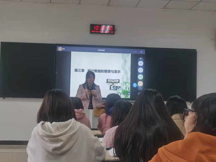 新教师走进郭老师的真实课堂,以《统计数据整理与显示》为内容,为大家展示了课堂组织、内容讲授和师生互动环节。首先她以今日新闻民航事故为引入案例,讲解如何对统计数据进行筛选、排序及统计整理;再以重庆经济研究数据及智力测试等案例,为学生讲解数据分组等内容。