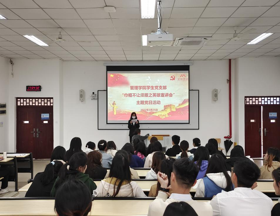 巾帼不让须眉,红颜更胜儿郎。为传承巾帼英雄的革命精神,践行“我为评估作贡献”系列活动,并结合管理学院女学生党员人数相对较多的特点。2022年3月25日17:00,学院学生党支部在6204教室开展了“巾帼不让须眉之英雄宣讲会”主题党日活动。本次活动由学院学生党员实践教育中心教育培训部干事蒋枭婷主持,各学生党支部共计80名同学参与。