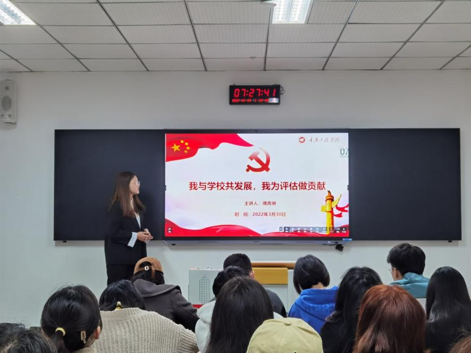重工新起点,迎评新征程。为进一步加强同学们迎接本科合格评估的意识,号召同学们以饱满的热情和良好的精神风貌迎接评估,2022年3月30日7:20,管理学院学生党支部在第六教学楼开展了“大学生微党课”进班级活动之“我为评估做贡献”。8名2019级学生预备党员走进晨课教室,向2020级同学们讲述了自己对于学校本科合格评估工作的理解与支持。