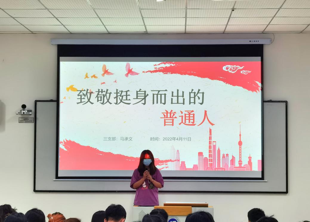 活动伊始,学生第三党支部的马承文同学以“致敬挺身而出的普通人”为题,围绕逆行者、人民英雄等关键词,讲述了挺身而出的普通人的故事。在火场中为营救被困群众而不幸英勇牺牲的消防员欧保尔、韦吉德,将青春的身影定格成了冲锋的姿态;在“8·12天津滨海新区爆炸事故”中无一人活着回来的天津港消防支队五大队,将他们的生命定格在了漫天火光中。还有永不坠落的扶贫志吴国良、冲锋陷阵的“瘦弱将军”肖云峰、“一封群众的请愿书”高克强......他们在平凡的岗位上铸就了生命的精彩华章,擦亮了道德星空,树起了时代标杆,挺直了民族脊梁。时政热点分享环节,同学们各抒己见,积极参与到讨论当中。跪地做心肺复苏连救3人的重庆女医生,让同学们感受到了英雄不过是普通人的挺身而出。“动态清零”总方针,让同学们明白了疫情形势依然严峻复杂,遵守防疫抗疫要求是每一个人的义务与责任。