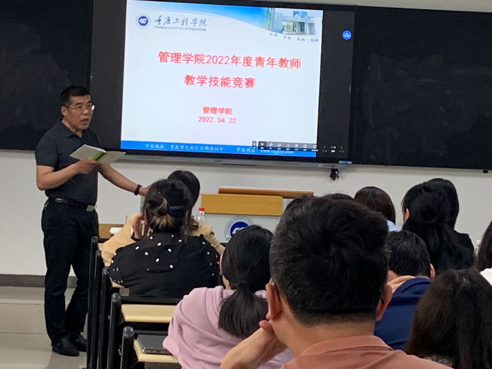 为建设高素质教师队伍,提高青年教师教育教学专业素养,强化青年教师教学基本功,搭建青年教师成长平台,管理学院于4月22日在6110教室开展了青年教师教学技能竞赛。本次比赛有7名来自管理学院3个系部推荐的优秀选手参赛,担任本次竞赛评委的是学校督导曹明武教授、郭爱平教授、万伟副教授及学院教务科长朱凤副教授。