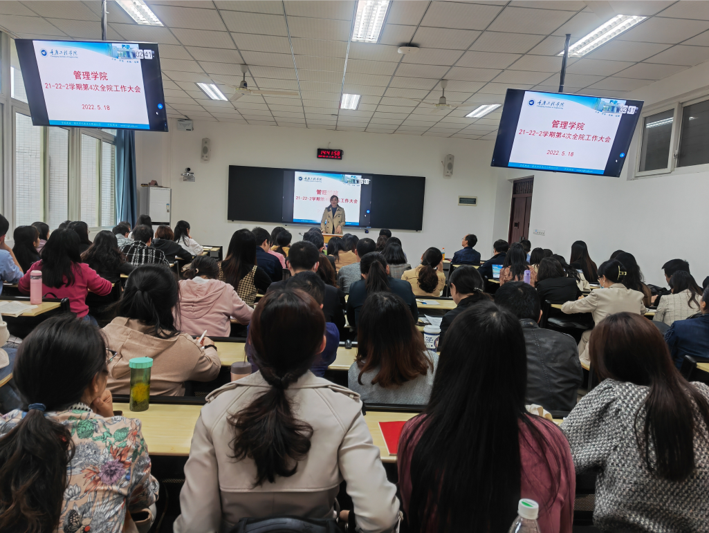 2022年5月19日下午14:30-16:00,6107教室,管理学院召开2021-2022学年第二学期第4次全院工作大会。校长助理简玉刚、党总支书记刘达斌、副院长李玲、副院长李英吉及学院全体教职工参加了大会。