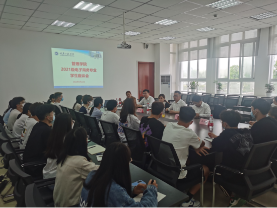 为加强我院教风学风建设,及时倾听同学们的心声,全面了解大一新生在校学习生活情况,营造良好的育人和学习环境,5月22日,管理学院在双桥校区第二会议室召开20212021级电子商务专业学生座谈会。校长助理兼管理学院院长简玉刚、党总支书记刘达斌、副院长李玲、电子商务教研室主任宋超、学工主任王燕楠以及来自21电子商务专业36名学生代表参加了此次座谈会。