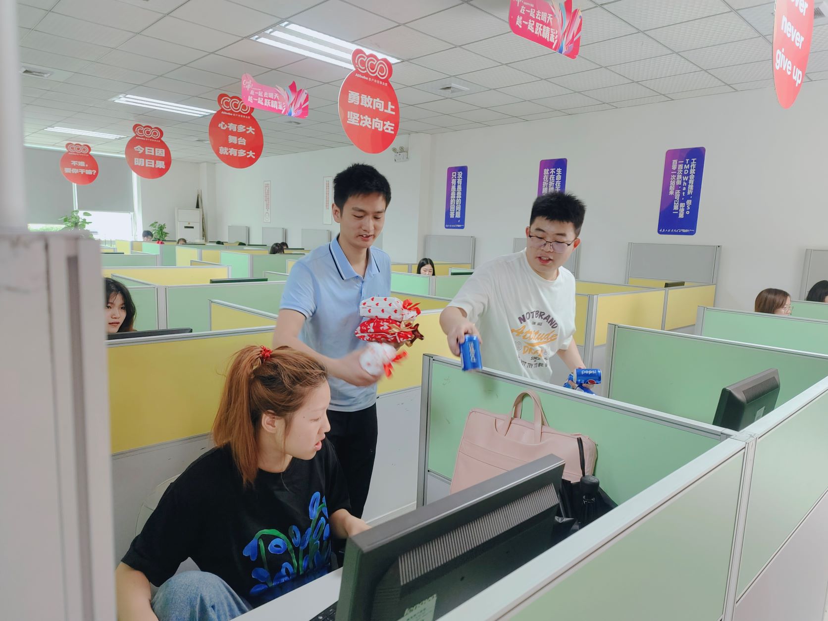 活动当天吸引了一百多名小二参与比赛,大家热情高涨,力争解决好会员的每一个问题,向着榜首冲刺!现场不仅有向着目标的努力的小二们,还有由阿里基地实训班主任和职能岗们组成的后勤保障团队为同学们准备好的“618能量加油包”,让在紧张的比赛氛围中的小二也能够适当的补充体力和能量!小二们努力在电脑前服务好每一位用户,职能团队和老师们在现场为小二们做好服务支撑,现场忙碌且有序!