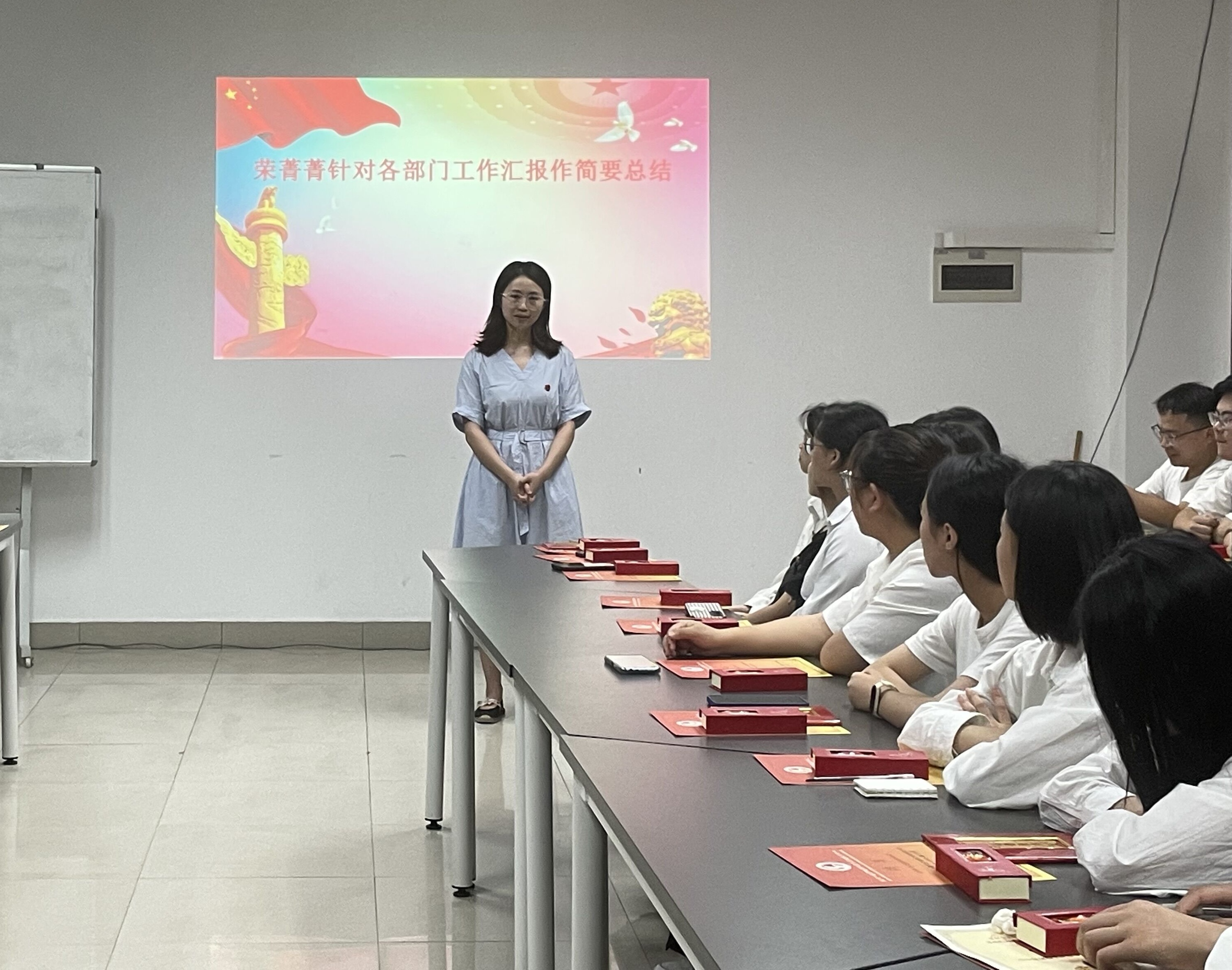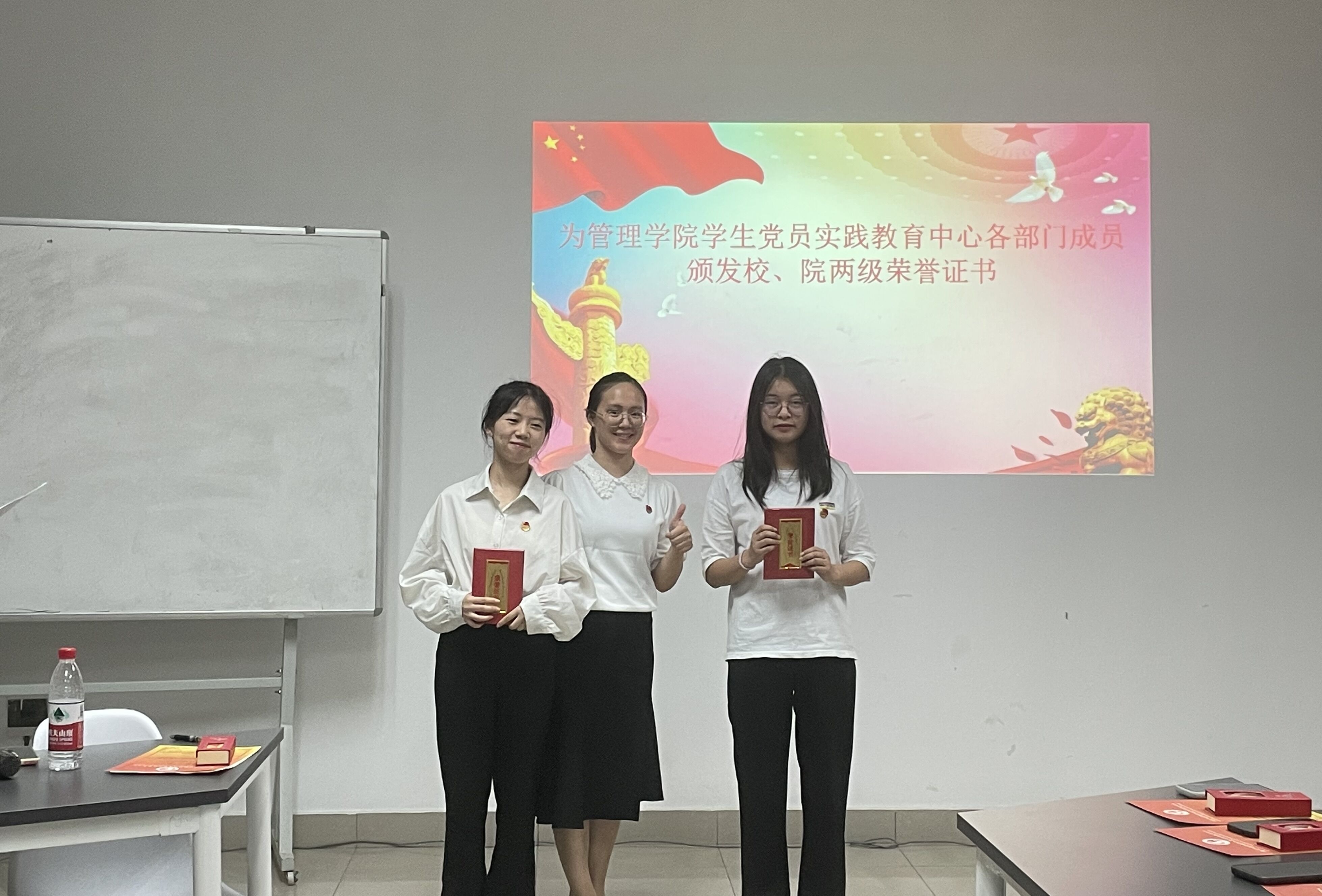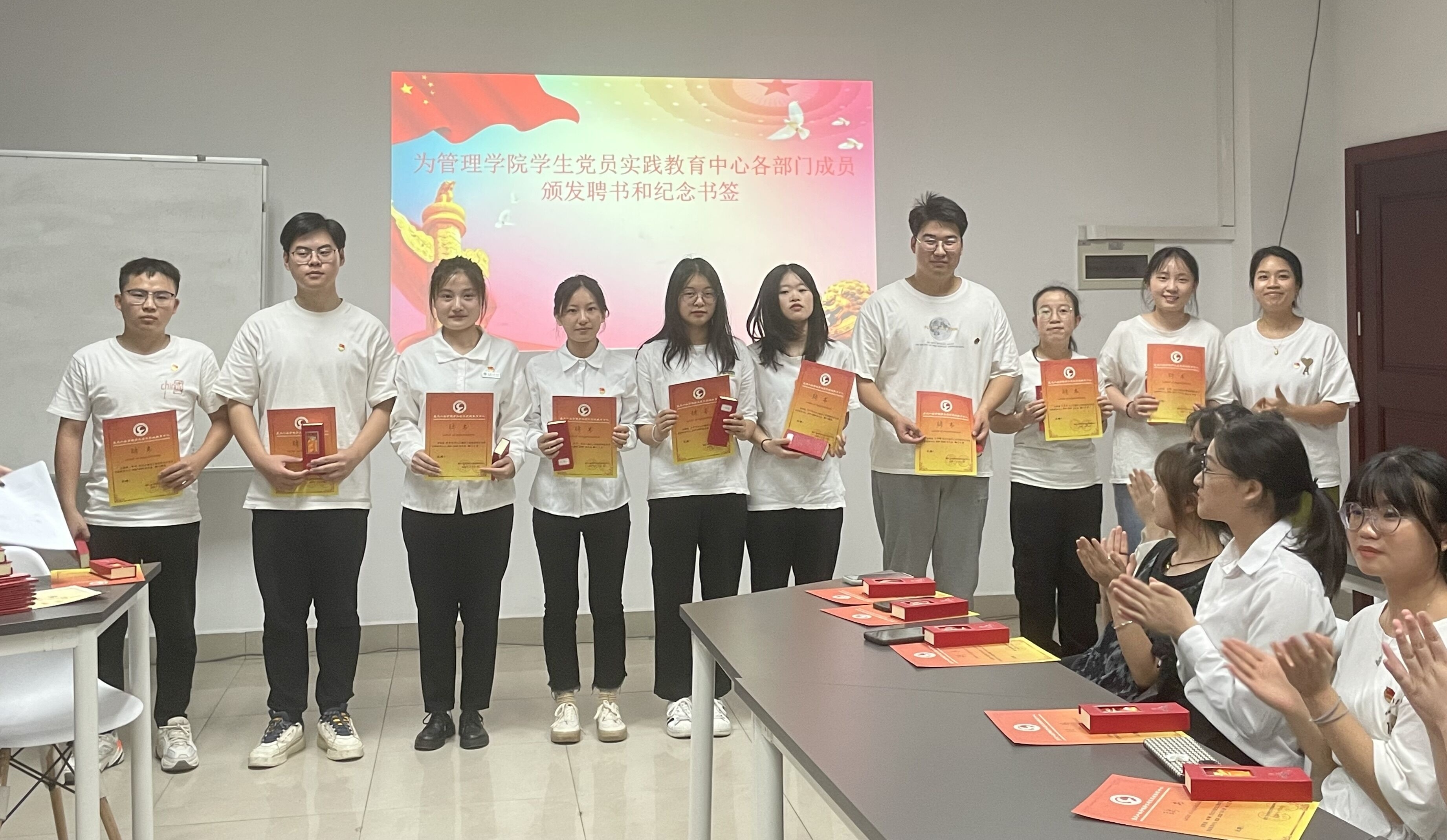 活动分为两个阶段,第一阶段的第一项流程是院学生党员实践教育中心各部门代表围绕本学年的工作情况、工作成效、工作不足及未来展望等四个方面进行总结汇报。第二项流程是与会老师为中心各部门成员颁发聘书和纪念书签,同时为表现优异的同学颁发校“优秀干部”,院“最佳进步奖”、“先进个人奖”等荣誉证书。第三项流程是荣菁菁老师针对中心各部门的工作汇报进行总结并提出建议、表达感谢,给予鼓励。第四项流程是尚伟书记讲话,尚书记对中心各部门的工作表示肯定,并寄语同学们要以更加饱满的热情和昂扬的斗志投入到新的学习工作中,一起把学院学生党建工作做得更好!