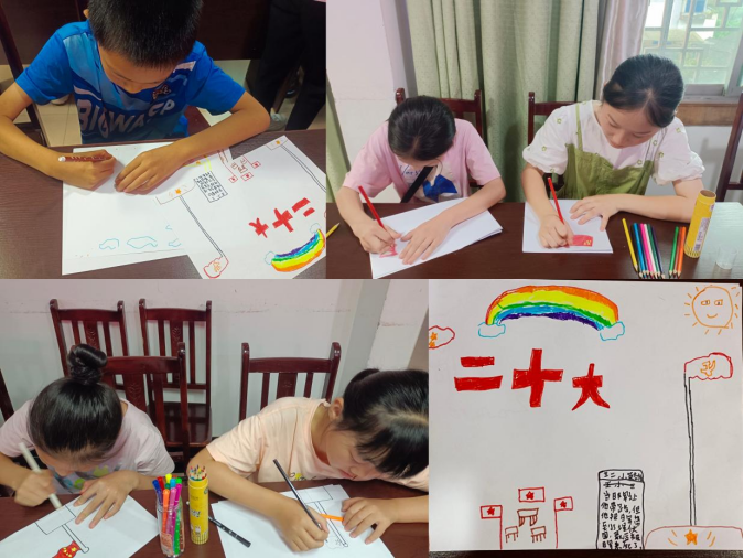 活动中志愿者与30名留守儿童进行互动交流,为儿童带去亲情关爱。活动第一项以“童心向党,喜迎二十大”为主题开展党史宣讲和知识问答,带领儿童初步认识党的二十大;活动第二项以“我心中的二十大”为主题开展绘画活动,孩子们通过绘画形式表达对党的热爱和对祖国的美好期待与祝愿。最后给每位儿童赠送雨伞和颜料,希望他们在保护伞下茁壮成长,生活多姿多彩。