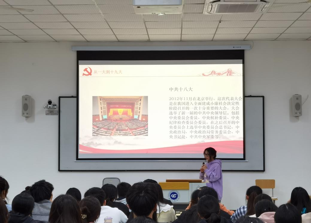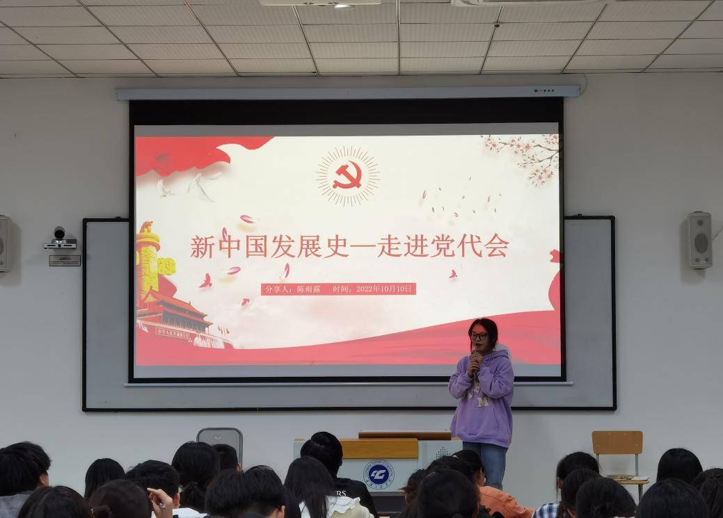 活动分为两个板块进行, 首先是分享展示。陈雨露同学为我们分享了“新中国发展史——走进党代会”。她在分享中为我们阐述了何为党代会,从三个方面介绍了党代会,并带领同学们一起回顾了从一大到十九大的光辉历程。每一次党代会都见证了中国的发展,表明了中国的道路也是在不断摸索中慢慢走出来的。陈雨露同学强调,作为新青年应该用饱满的热情和实际的行动来迎接党的二十大胜利召开!紧接着是视频学习,视频展现了中国共产党的百年奋斗史,一幕幕历史的呈现,让同学们明白要满怀激情去奉献自己的青春,建设美丽的祖国,生逢盛世不忘历史,正值青春不负韶华!
