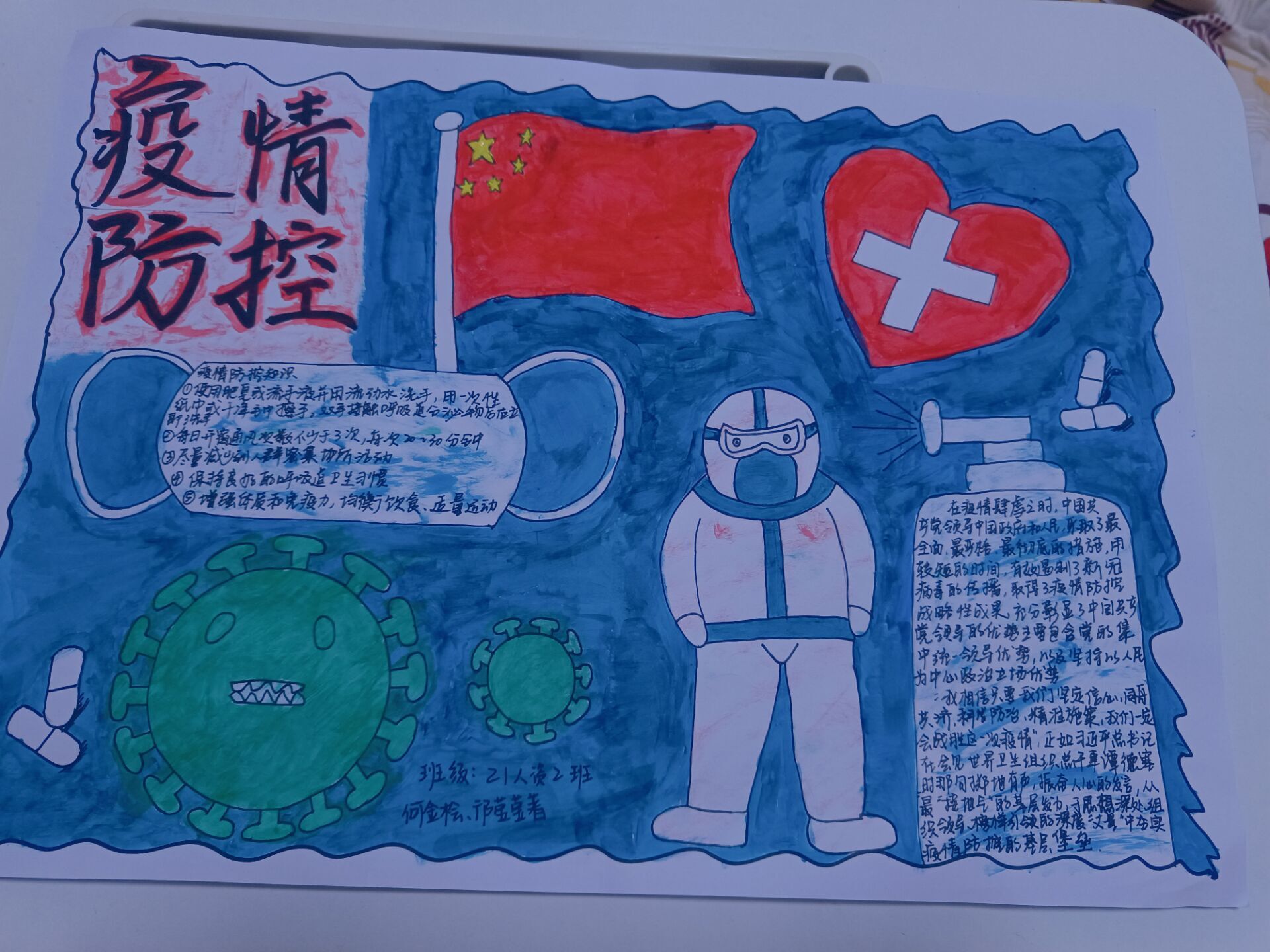 “海底小纵队”采用手抄报的形式,以蓝色为底,以国旗和医护人员为主要元素,反映出疫情下人民的生活环境,也衬托出国家和人民上下一心,共同抗疫,筑起新的“长城”。