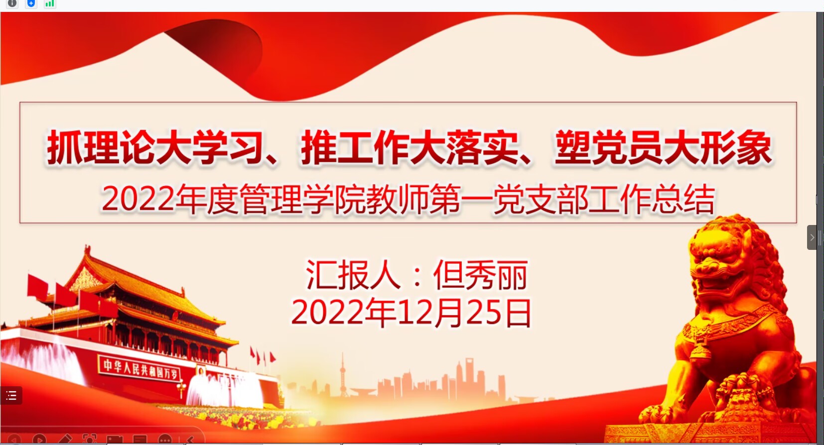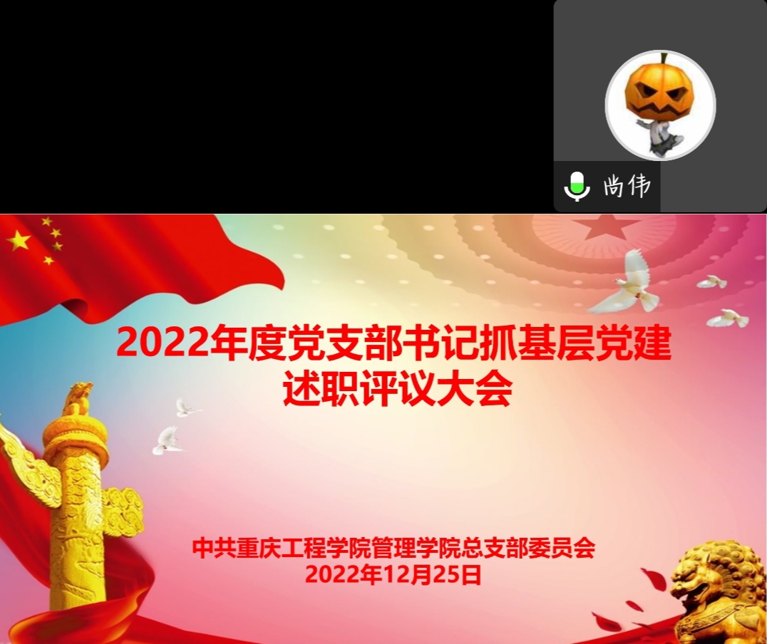 (文/图 学生党教中心 何金桧)为进一步总结2022年度党支部书记抓基层党建工作情况,推动基层党组织全面进步全面过硬,管理学院党总支于12月25日在线上开展了2022年度党支部书记抓基层党建述职评议大会。本次大会由学院专职组织员荣菁菁主持,学院党总支部委员会委员、各学生党支部书记共计12人参与。