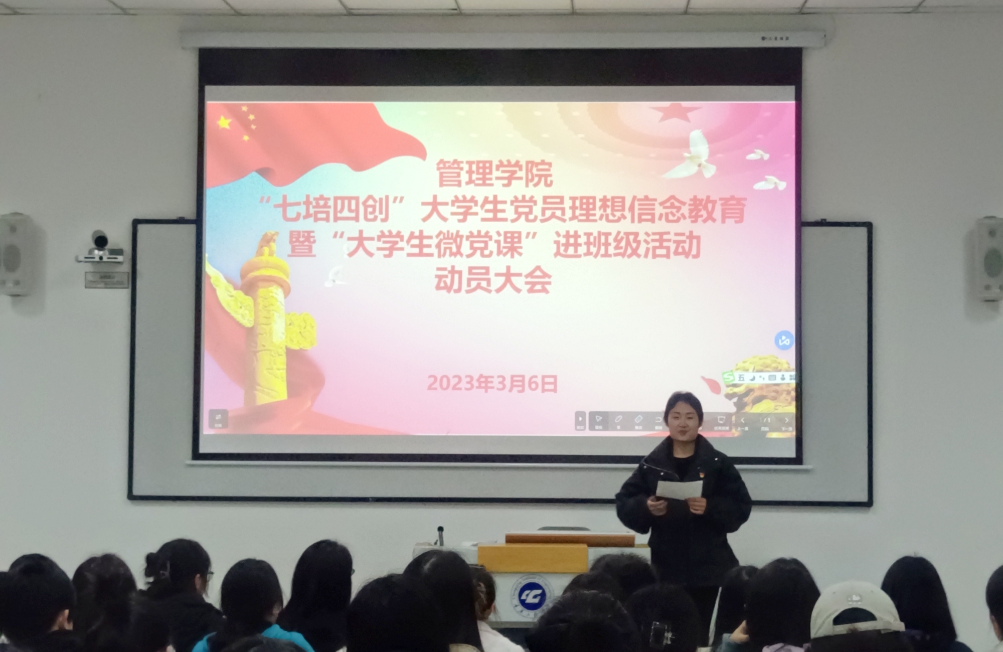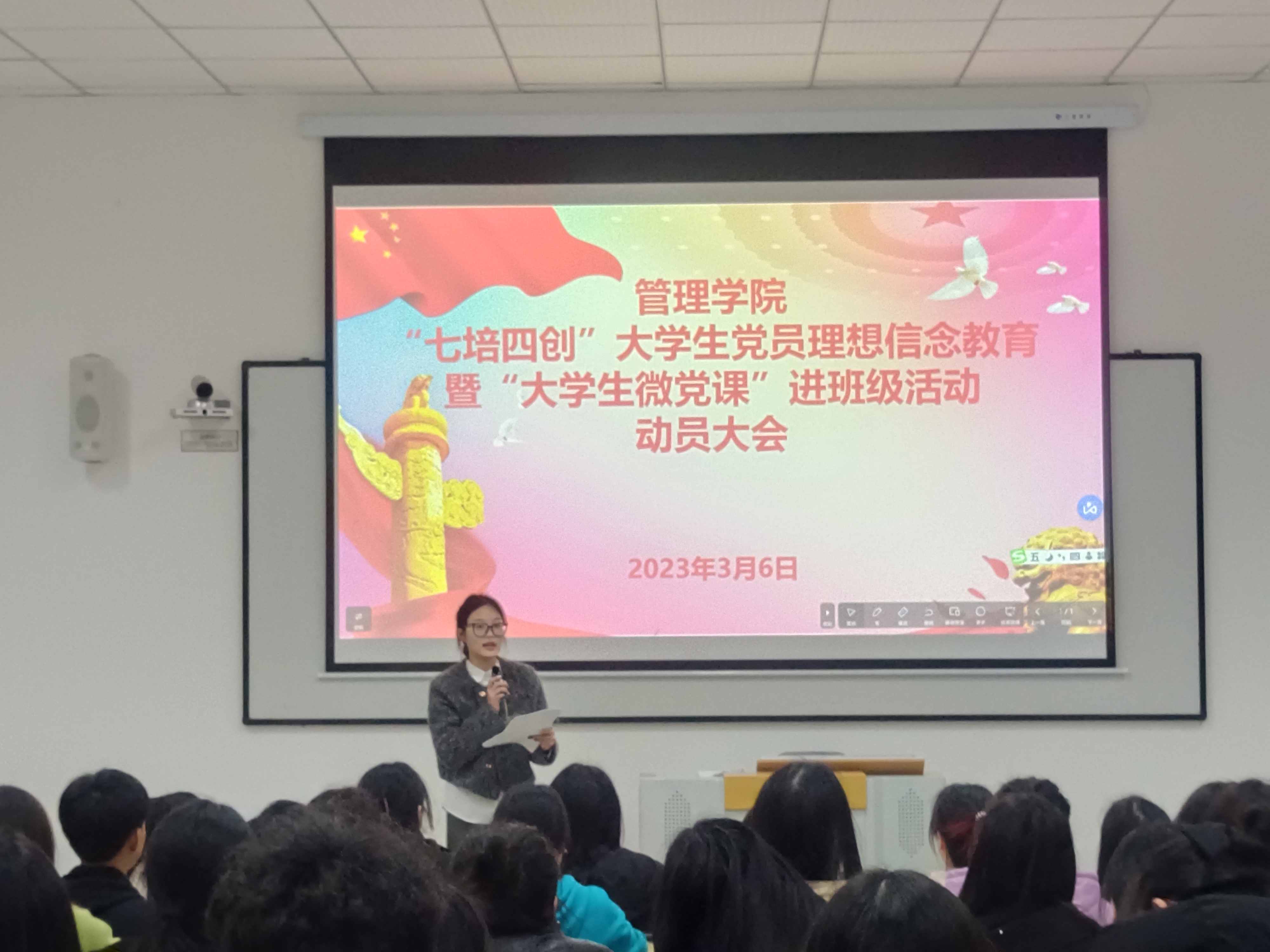 (文/图 学生党教中心 何金桧)为进一步加强管理学院学生党员实践教育建设,筑牢学生党员理想信念根基,管理学院党总支于3月6日在第六教学楼开展了“七培四创”大学生党员理想信念教育暨“大学生微党课”进班级活动动员大会。本次活动由学院学生党员实践教育分中心办公室干事殷羽主持,共计64人参与。