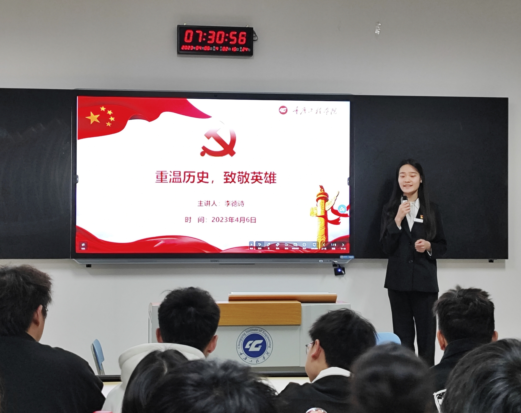 赓续英烈精神,传承红色基因。本次“大学生微党课”进班级活动,有利于进一步厚植同学们的爱国主义情怀,号召同学们在铭记历史中汲取精神力量,在抚今追昔中坚定前行意志,凝聚中华民族伟大复兴的磅礴力量。