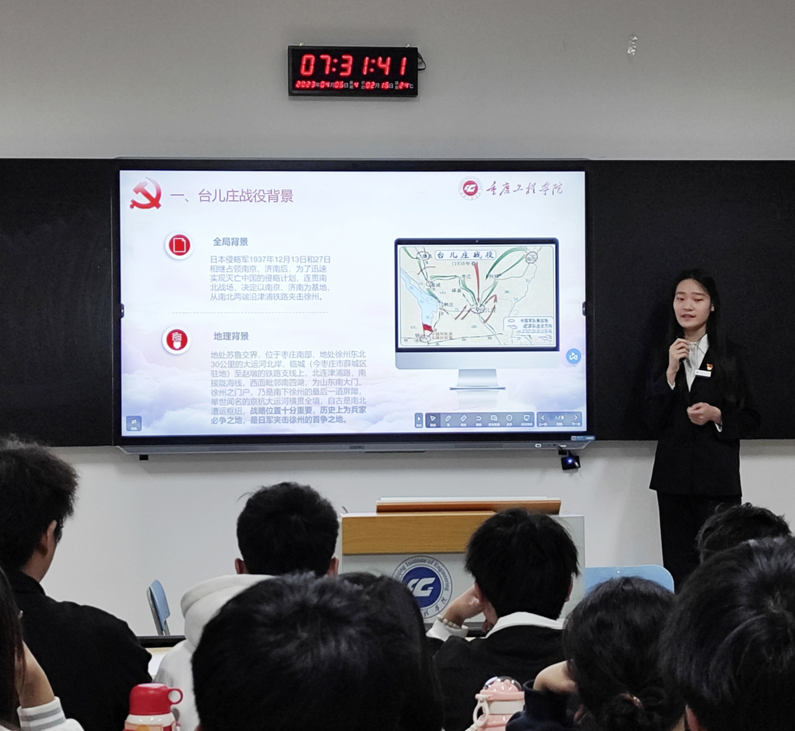 (文/图 学生党教中心 张丽梅)为进一步感悟党的光辉历史,追寻英雄烈士的事迹和精神,激发青年学生的爱国主义情怀,管理学院党总支于4月6日在第六教学楼开展了“大学生微党课”进班级活动。9名学生预备党员走进晨课教室,向2021级同学们进行“重温历史,致敬英雄——台儿庄大捷”主题宣讲。