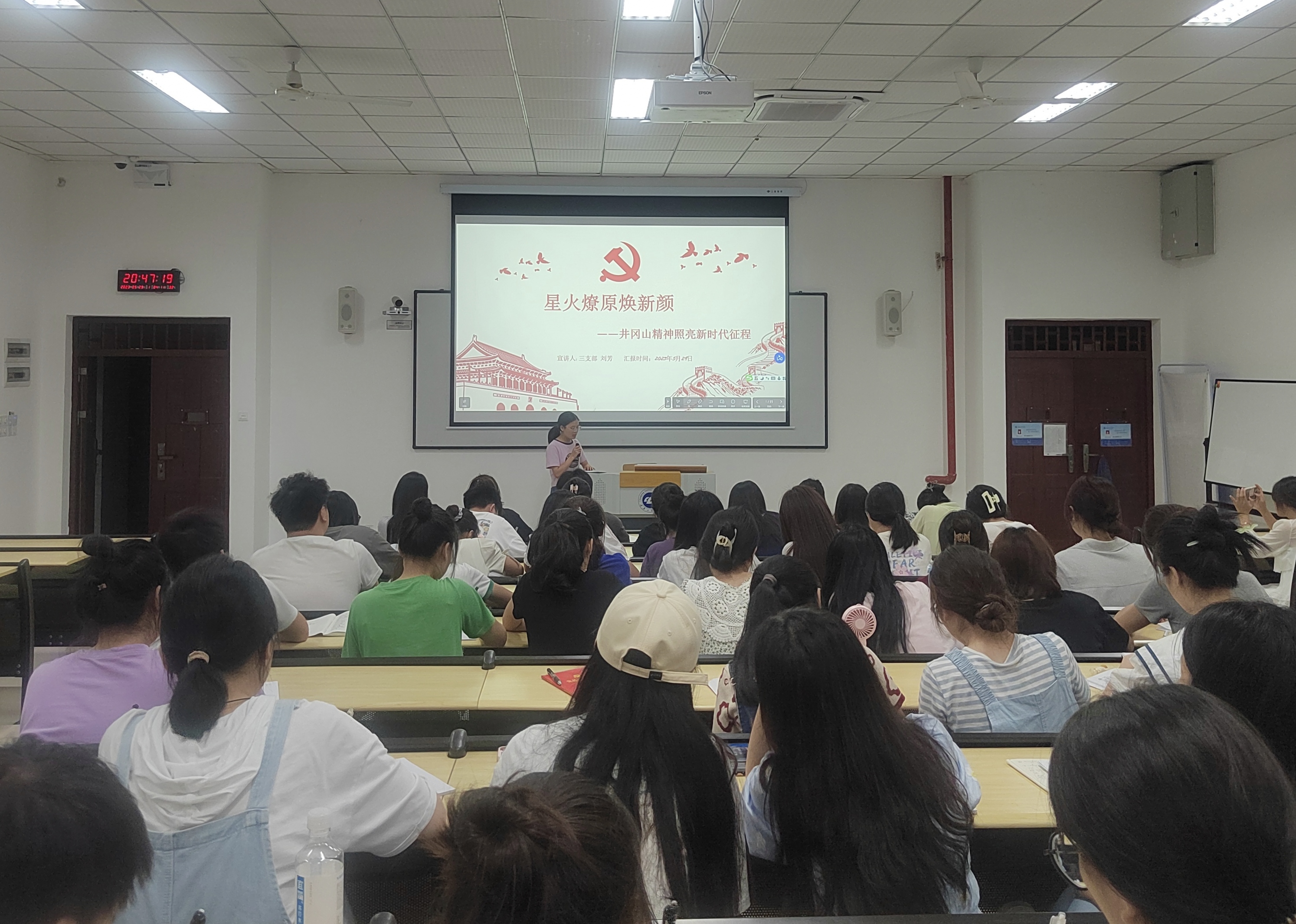 宣讲人刘芳以“星火燎原焕新颜——井冈山精神照亮新时代征程”为主题,围绕井冈山精神的科学内涵、井冈山精神的现实意义及让井冈山精神放射出新的时代光芒三个部分进行分享。井冈山精神是产生于革命时期、根植于中华民族的精神,是中华民族传统文化的体现与精华,它展示了中华民族艰苦奋斗的生命力、依靠群众的凝聚力、敢闯新路的创造力。井冈山精神这一开创性革命精神,已经深深熔铸于中国共产党人的血脉之中,始终鼓舞激励着我们党勇往直前。刘芳同学强调,作为新时代青年,同学们要结合新的时代条件,坚定理想信念、实事求是,让井冈山精神放射出新的时代光芒。