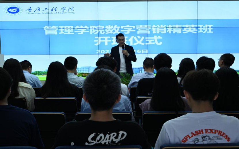 本次仪式首先由管理学院院长简玉刚教授发表讲话,他表明数字营销精英班是为了培养数字营销精英人才而开设,学校高度重视,将投入大量师资、设备资源。要求学生树立目标、落实行动、做到坚持、获得结果。随后数字营销系主任周小波教授讲解了数字营销精英班未来课程安排。