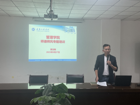 会议第三项议程由简玉刚院长进行师德师风专项培训。培训会上简院长首先领学了《中国人民共和国教育法》、《中国人民共和国教师法》、《中华人民共和国高等教育法》、《关于加强和改进新时代师德师风建设的意见》、《新时代高校教师行为十项准则》等重要文件,对其重点内容进行详细解读、分析及提醒,简院长一方面通过教书育人楷模、优秀教师等师德榜样和先进事迹激励广大教师坚定理想信念、厚植爱国情怀、涵养高尚师德,学习优秀榜样;另一方面通过违反教师职业行为十项准则典型案例和查处的严重师德违规问题为反面教材,深入学习掌握新时代教师职业行为十项准则,提升教师的规则意识,引导全体教师以案为鉴,警钟长鸣。简院长强调必须把提高教师思想政治素质和职业道德水平摆在首要位置,把社会主义核心价值观贯穿教书育人全过程,突出全员全方位全过程师德养成,推动教师成为先进思想文化的传播者、党执政的坚定支持者、学生健康成长的指导者。