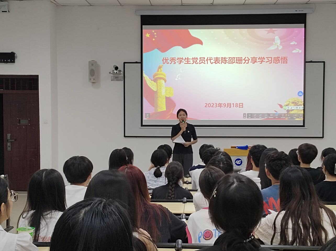 “启事在教诲,成事在榜样”。活动最后,优秀学生党员代表陈邵珊进行了学习感悟分享。她讲述自己过去两年一共参加了四十余次“七培四创”大学生党员理想信念教育,从一位旁观者、工作者到参与者,不管是工作经验还是学习经历都让她收获颇多;她鼓励同学们积极参加“七培四创”大学生党员理想信念教育,在学习中储备知识、在实践中锤炼本领,同时号召同学们要铭记历史,勿忘“九一八”,追思先烈、珍爱和平,以青春之我,担时代之责。