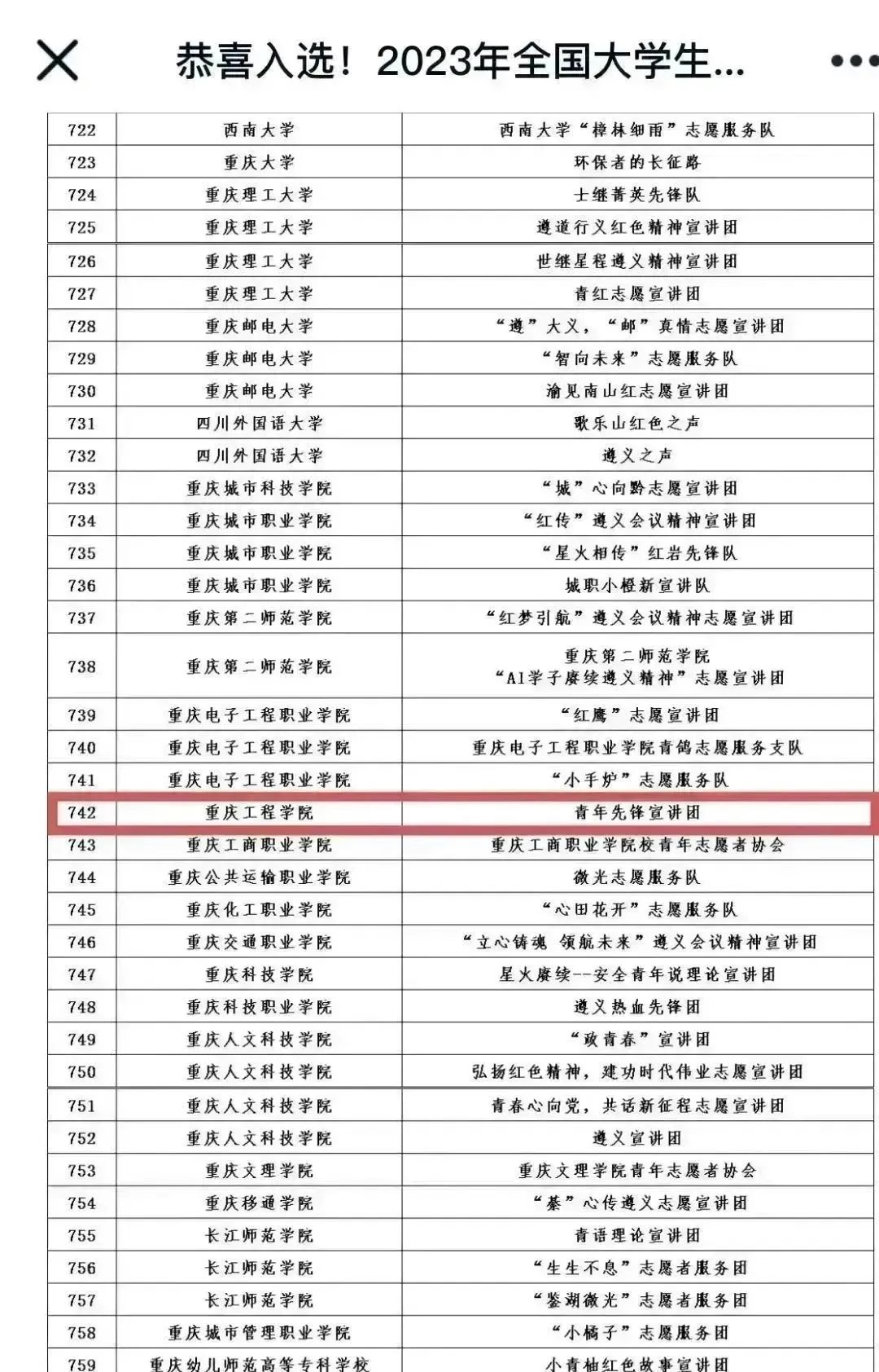 10月13日,2023年全国大学生遵义会议精神志愿宣讲团入选团队名单公布,重庆工程学院青年先锋宣讲团成功入选。
