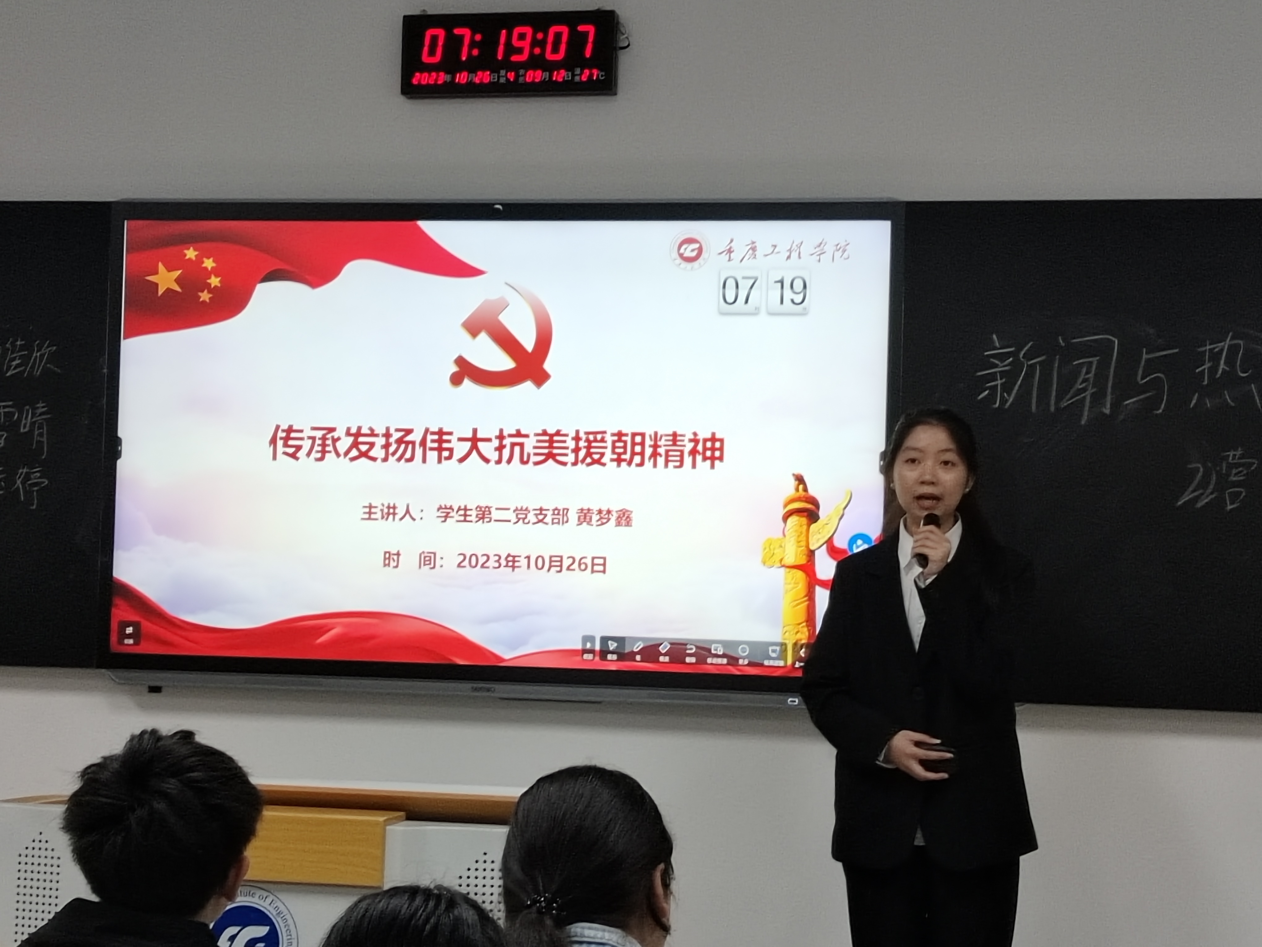 (图/文 学生党教中心 段晗晗)历史云烟不散,精神丰碑永存。为传承抗美援朝精神,铭记革命先辈,加强爱国主义教育,凝聚中华民族团结奋进、朝气蓬勃的生命力,管理学院党总支于10月26日在第六教学楼开展“大学生微党课”进班级活动。9名学生预备党员走进晨课教室,向2022级同学们进行“弘扬抗美援朝精神,书写伟大盛世愿景”主题宣讲。