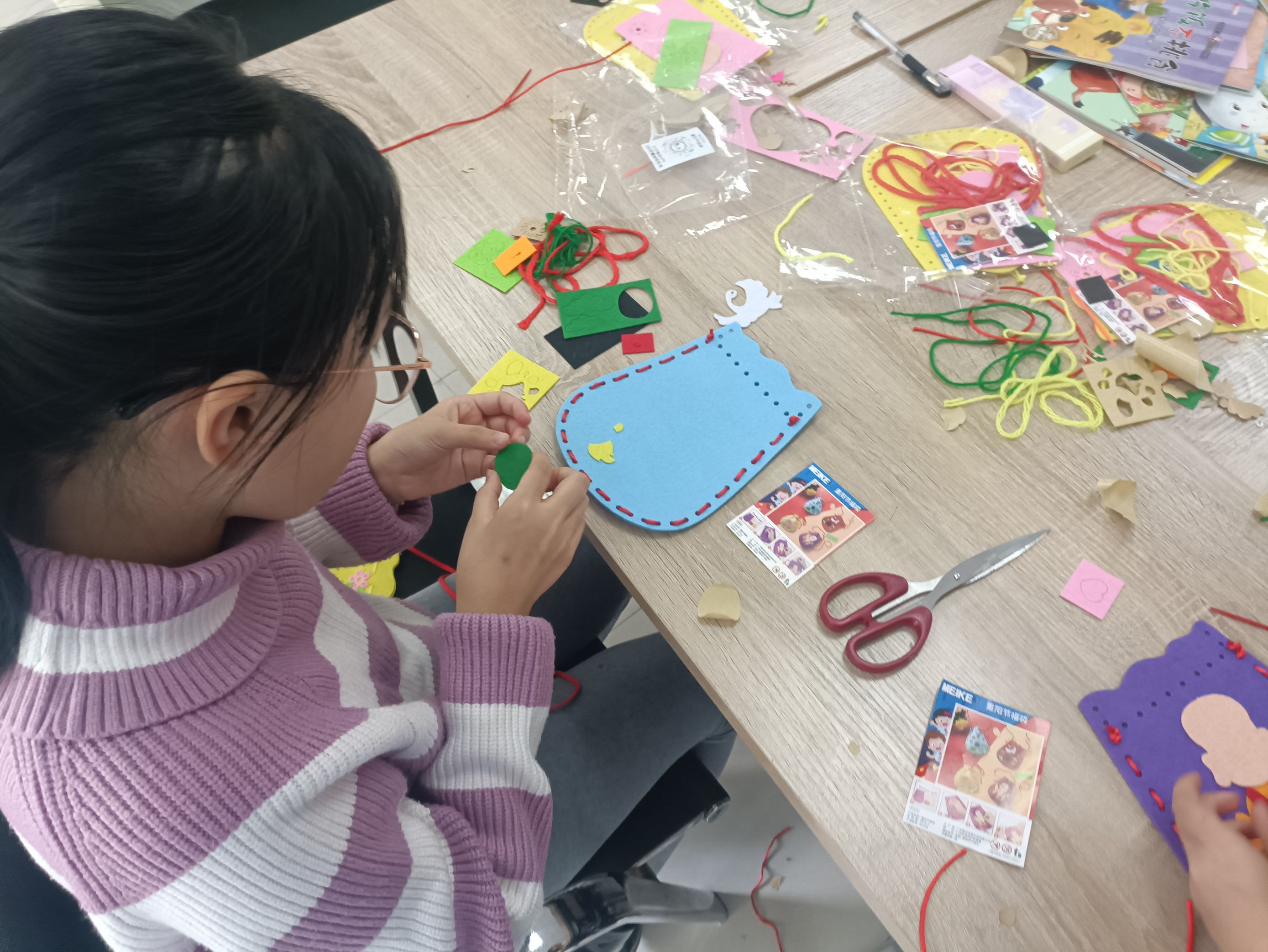 随后,志愿者们向社区少年儿童展示了各种手工材料,讲解了这些材料所代表的传统手工文化的发展历程,并将准备好的手工制作材料逐一分发给小朋友们,耐心地指导他们按照步骤进行制作。在家长们的陪伴和志愿者们的帮助下,小朋友们逐渐掌握了制作福袋的技巧。时间流转,一个个精致、充满童趣的手工福袋呈现在眼前。小朋友们互相展示着自己的作品,拍照留念,并期待在活动结束后,将亲手制作的手工作品赠送给家中长辈,以表达他们对长辈的孝敬和感恩之情。