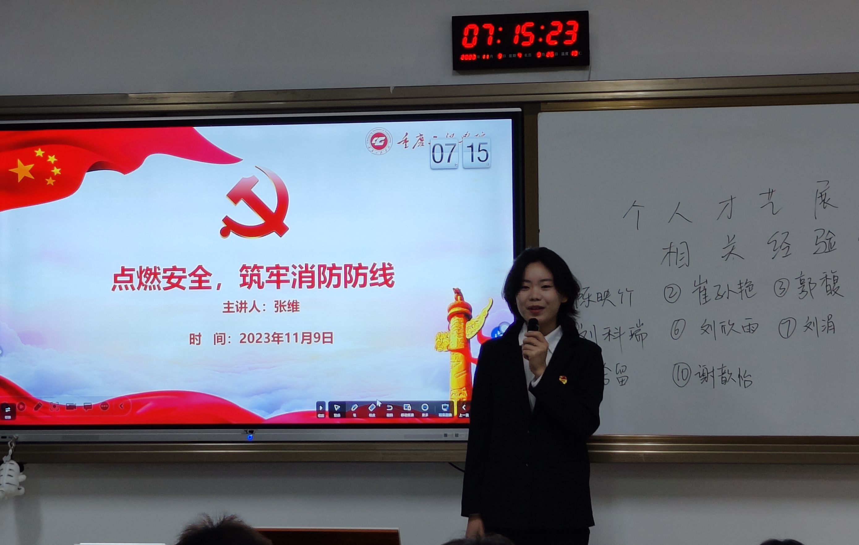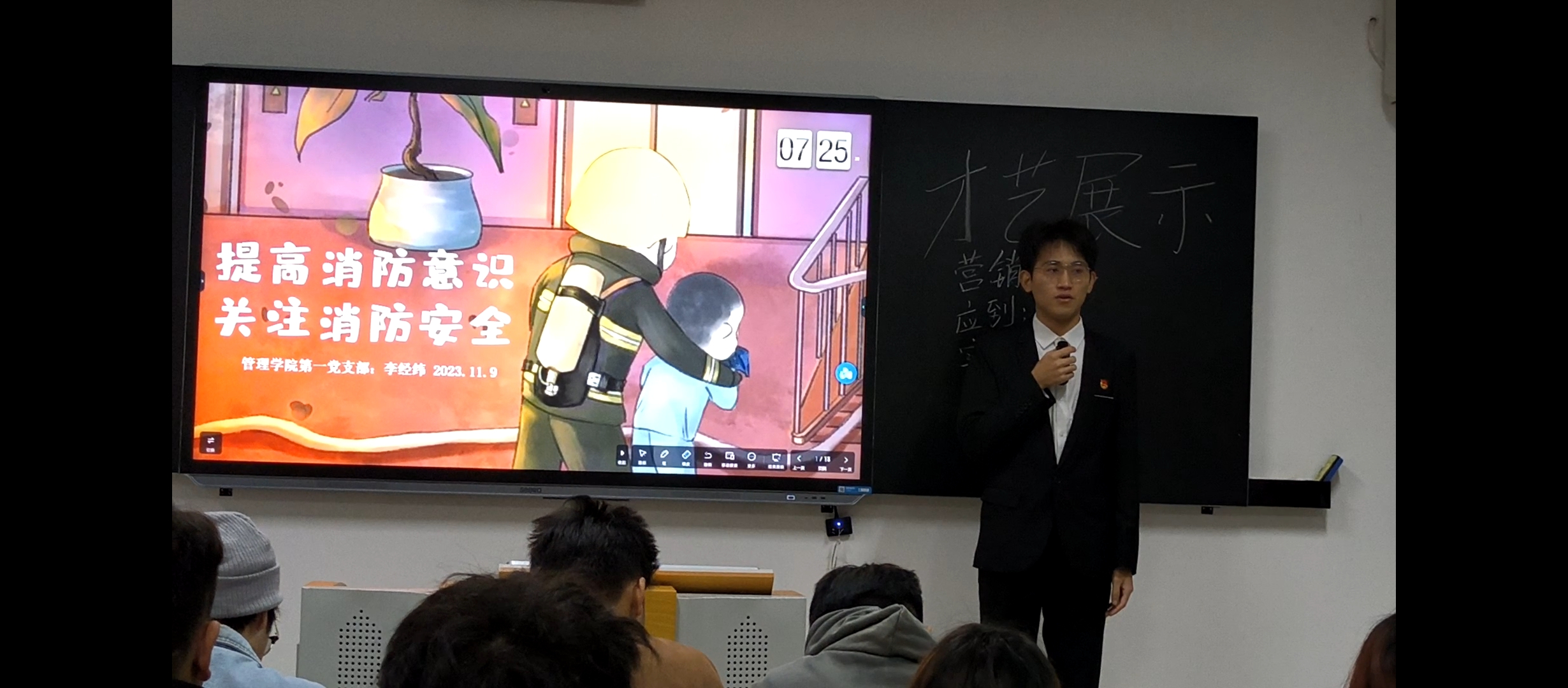(图/文 学生党教中心 敬维佳)预防为主,生命至上。为提高同学们消防安全意识,宣传消防救生技巧和有关知识,管理学院党总支于11月9日在第六教学楼开展“大学生微党课”进班级活动。9名学生预备党员走进晨课教室,向2022级同学们进行“注用火安全,提消防意识”主题宣讲。