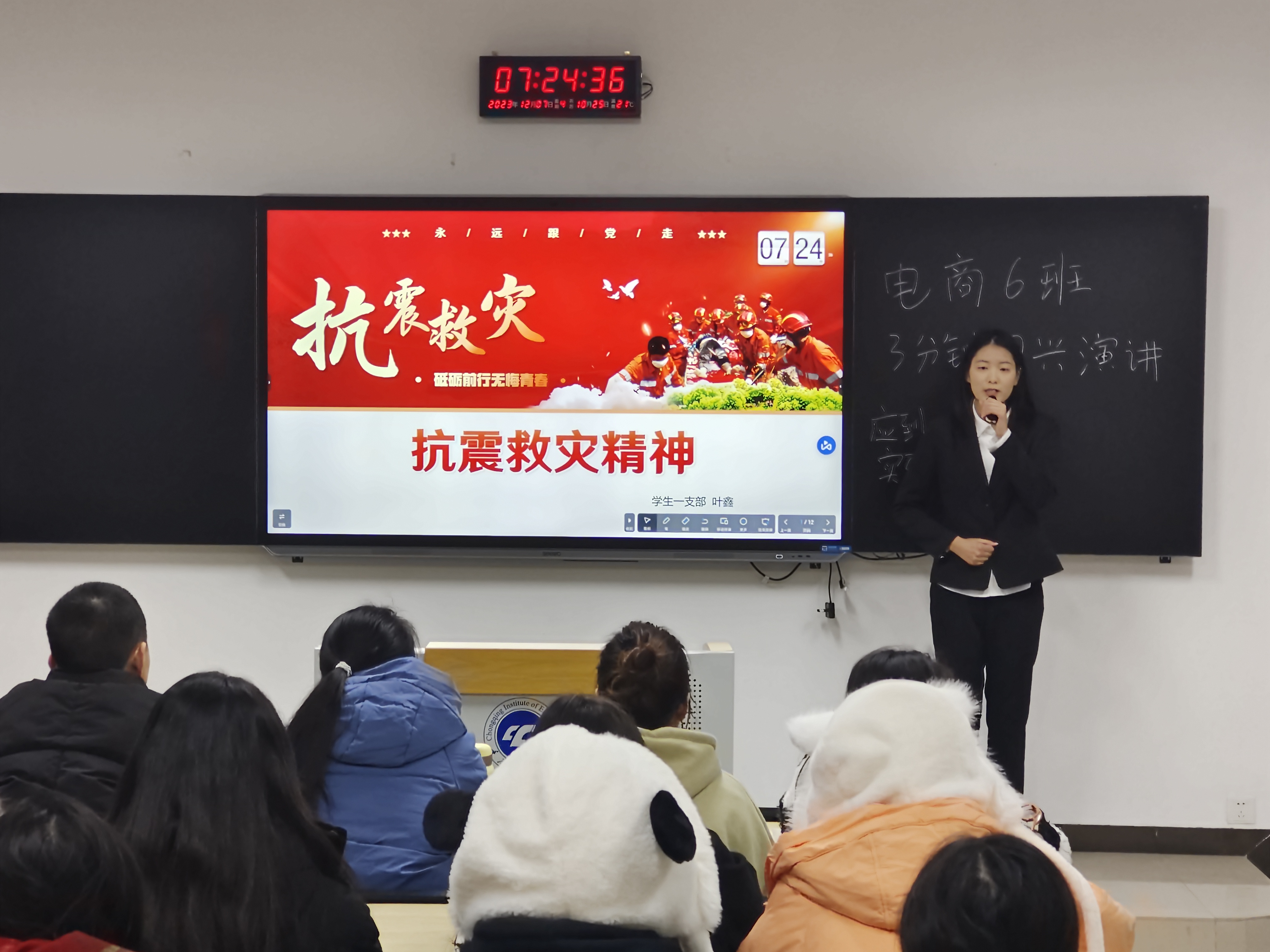 (图/文 学生党教中心 方蓓蕾)为大力弘扬伟大抗震救灾精神,充分展现中华民族自强不息、团结奋斗的民族品格,管理学院党总支于12月7日在第六教学楼开展“大学生微党课”进班级活动。9名学生预备党员、发展对象走进晨课教室,向2022级同学们进行“弘扬抗震救灾精神,砥砺前进无悔青春”主题宣讲。
