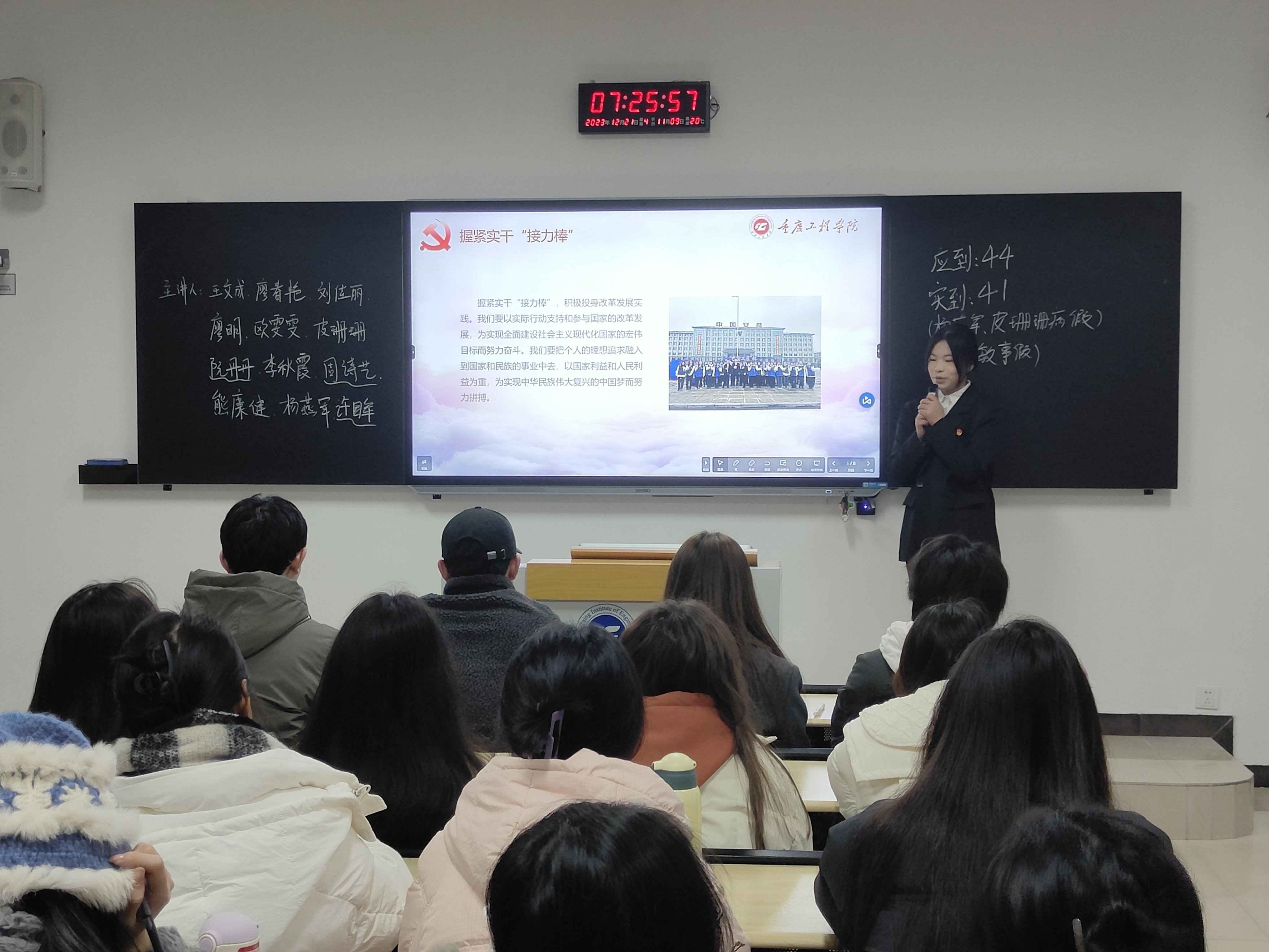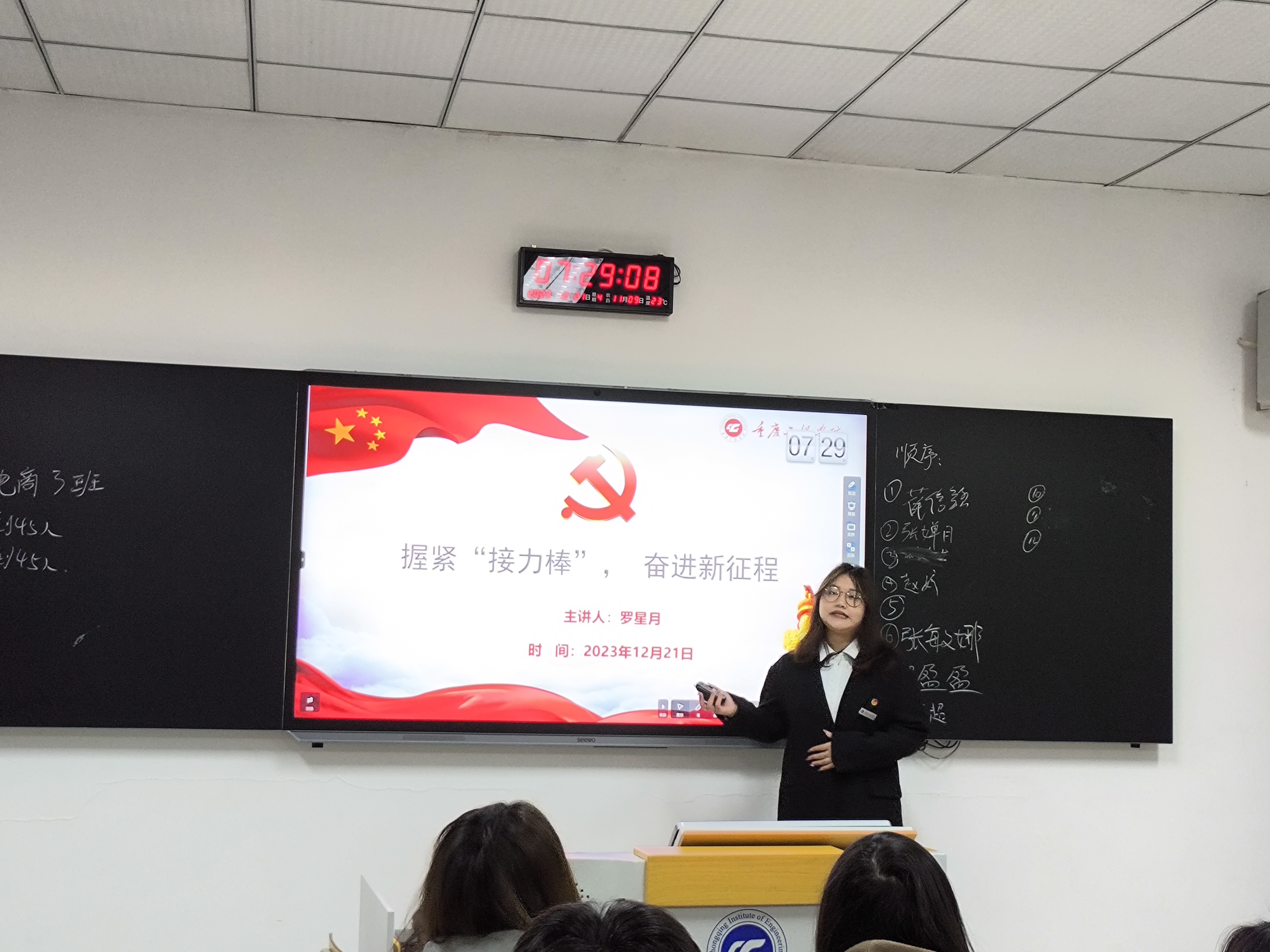 (图/文 学生党教中心 方钦政)为强化理论自觉,牢记初心使命,激发青年学生党员的责任意识和担当意识,管理学院党总支于12月21日在第六教学楼开展“大学生微党课”进班级活动。9名学生预备党员、发展对象走进晨课教室,向2022级同学们进行“握紧‘接力棒’,奋进新征程”主题宣讲。