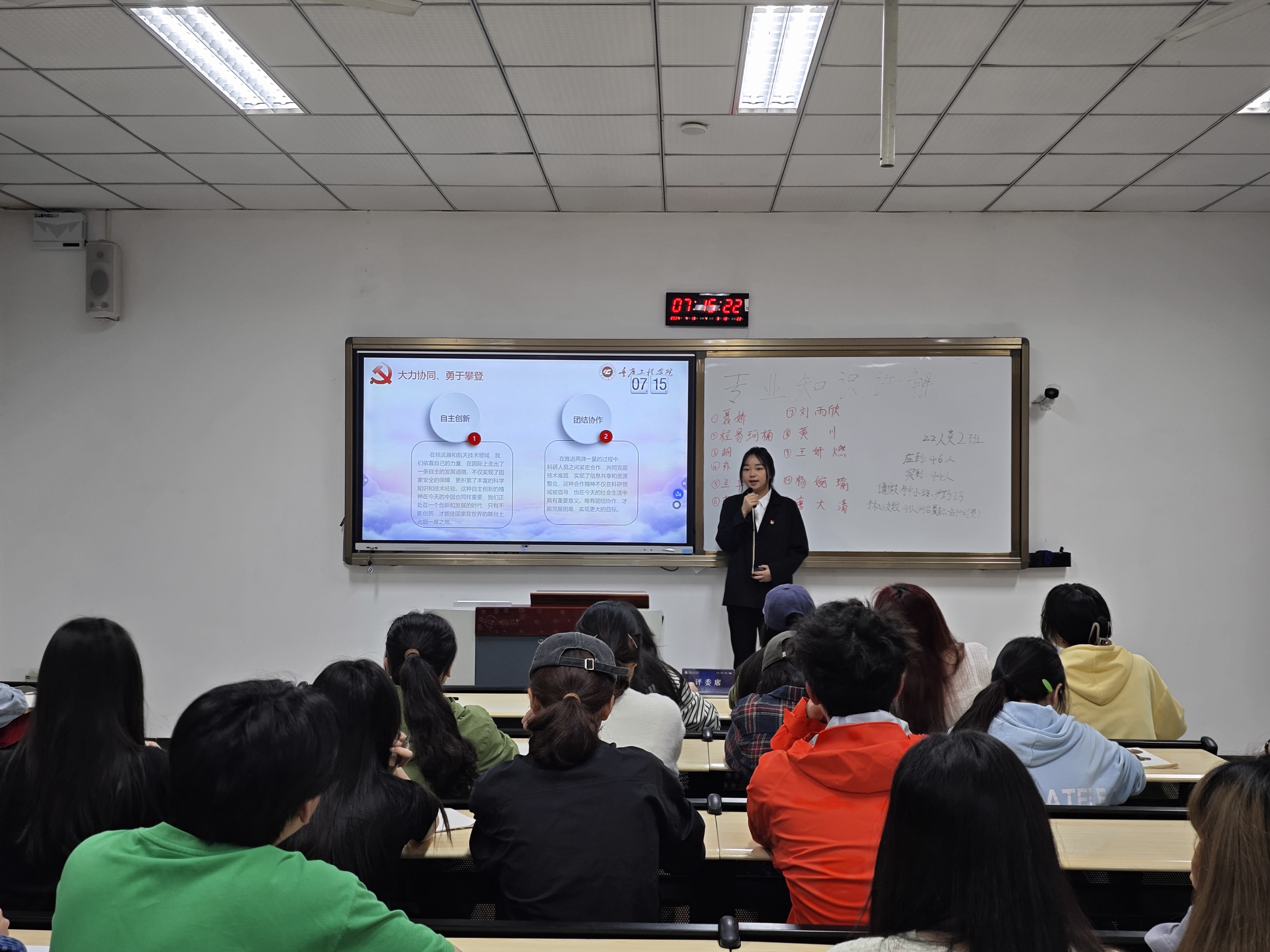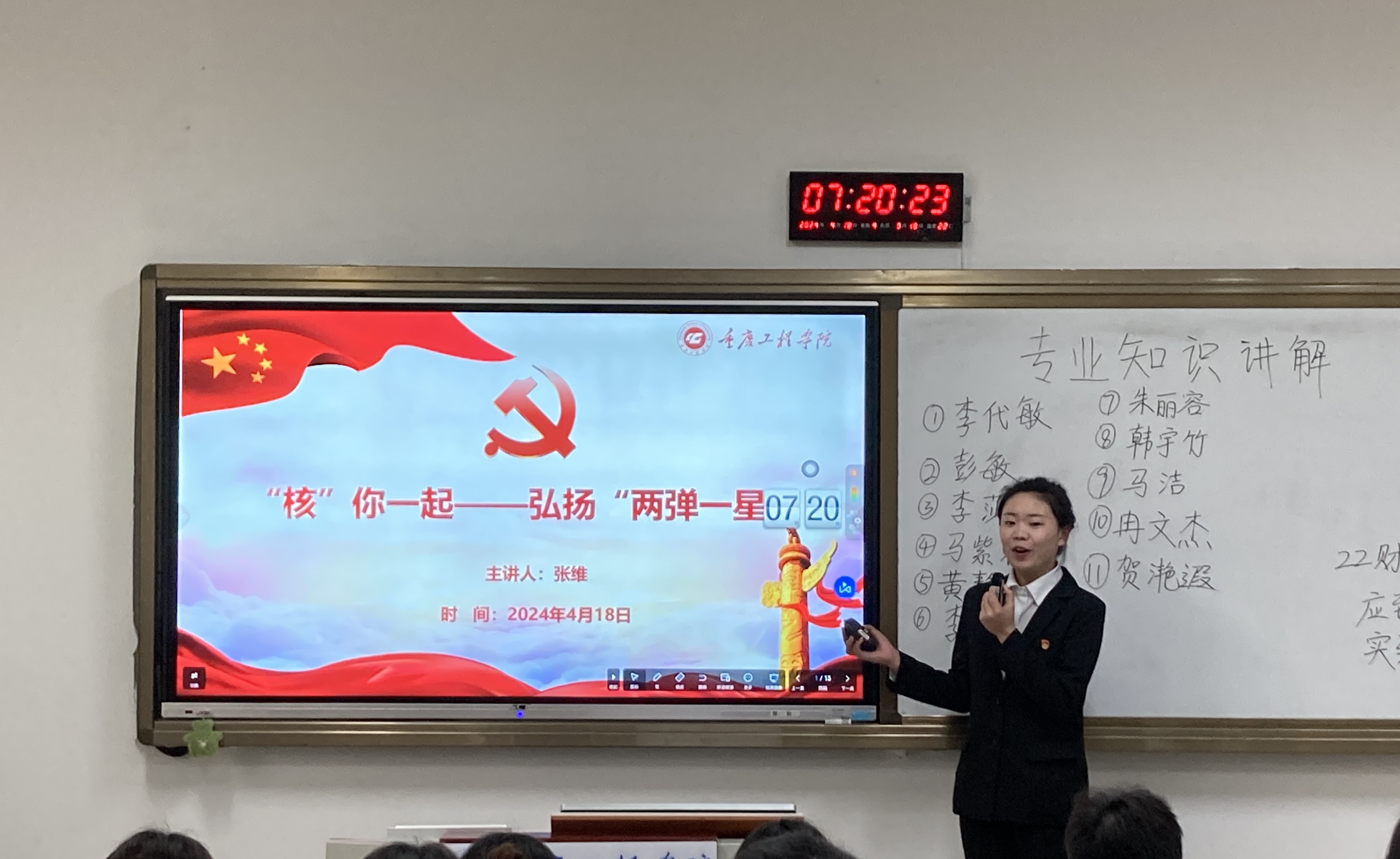(文/图 学生党教中心 王莉)强国有我,是时代的召唤,更是青春的担当。为了更好地传承“两弹一星”精神,结合学院七培四创大学生理想信念教育方案,管理学院党总支于4月18日在第六教学楼开展“大学生微党课”进班级活动。6名学生预备党员走进晨课教室,向2022级同学们进行“强国有我,‘核’你一起——弘扬‘两弹一星’精神”主题宣讲。