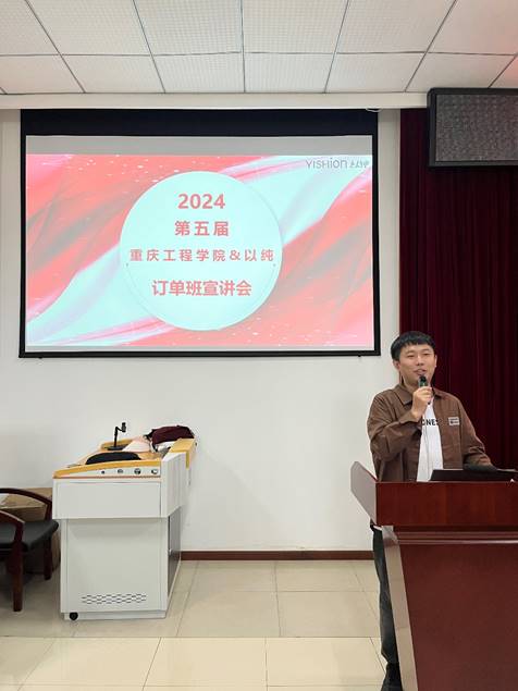 以纯重庆办事处人才组主管余正洋进行了订单班宣讲。余主管介绍了以纯的发展历史、经营范围、经营理念、公司架构、产品情况以及订单班培养模式、薪资待遇、晋升通道等,让同学们和以纯服饰有了近距离的接触,也对以纯订单班有了全面的认识。余主管希望大家能加入以纯实现自己的梦想,也希望大家能和以纯一起共同成长,把握好机会,在以纯开心工作、快乐生活。