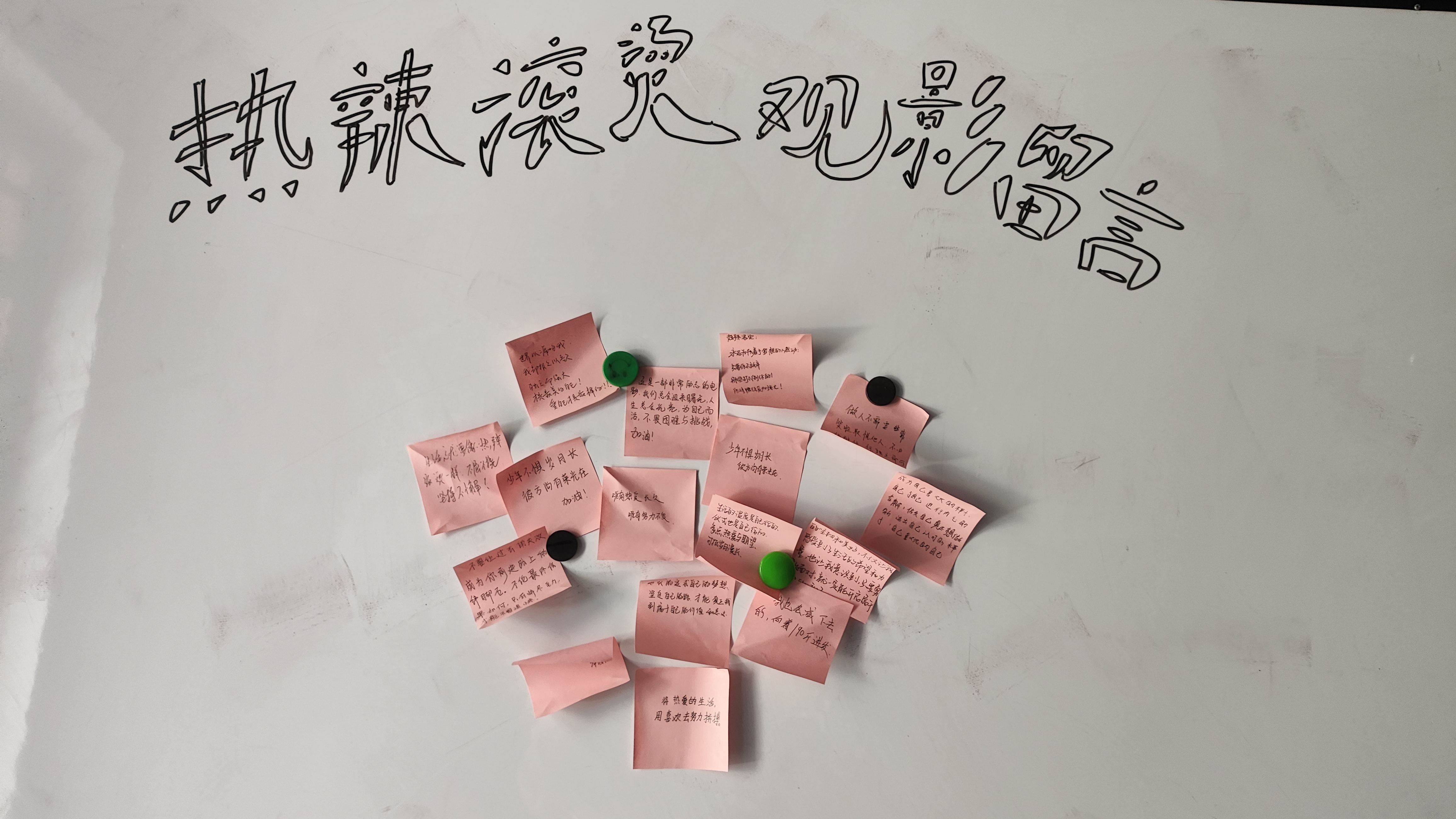 活动伊始,同学们一同观看了由贾玲执导并领衔主演的喜剧电影《热辣滚烫》。该电影讲述了宅家多年的乐莹在结识拳击教练昊坤后,如何克服内心的恐惧和外界的挑战,最终开启滚烫人生的故事。该电影为社团成员传递了正能量和励志精神,鼓励成员们面对困难不屈不挠、坚持不懈。观影结束后,成员们在小纸条上留言并贴在白板上。