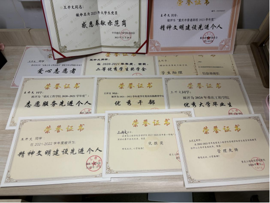 大学四年,对于王开文来说是充满激情与奋斗的四年。作为班级学习委员,她以身作则为班级树立良好学风,积极调动班级学习氛围,同时作为管理学院学生党员实践教育中心干部,她用实际行动为学院党教中心奉献属于自己的力量。此外,她还积极参加社会实践活动,全面提升自己的综合素养。