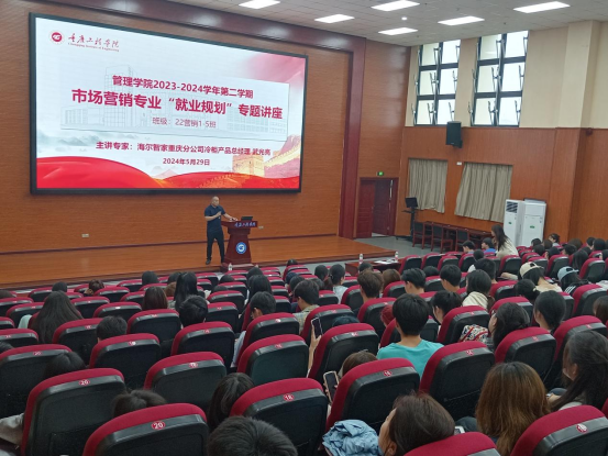 (文/图 数字营销系 唐菠)为持续深化精准就业服务工作,帮助在校学生明确职业发展路径,着力提升学生就业能力,树立正确的就业观择业观,5月29日下午,管理学院邀请海尔智家股份有限公司重庆分公司冷柜产品总经理武光亮于学校南泉校区7807报告厅为2022级市场营销专业约200余名学生带来一场题为《就业规划》的专题讲座,海尔智家股份有限公司重庆分公司人才发展经理刘洪霞女士也应邀参加了本次讲座。