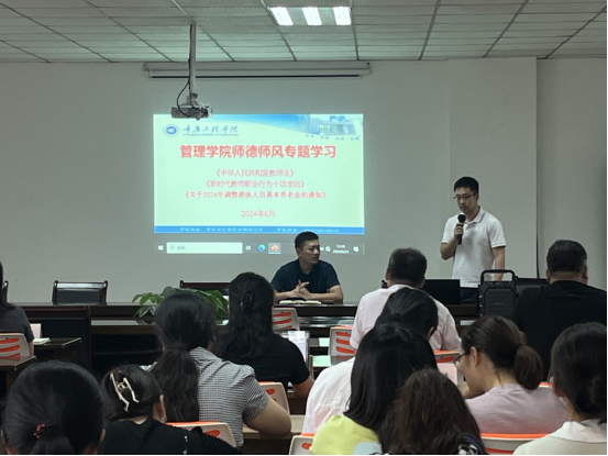 (文/图 办公室 周黎)为进一步加强师德师风建设,提升高校教师的职业道德水平和业务能力,引导广大高校教师深入学习《中华人民共和国教师法》《新时代教师职业行为十项准则》等系列文件,从而增强教师的责任感、使命感和荣誉感,规范职业行为,明确师德底线,管理学院于2024年6月21日在3教602开展师德师风专题学习培训活动,学院院领导、全体教职工参加。