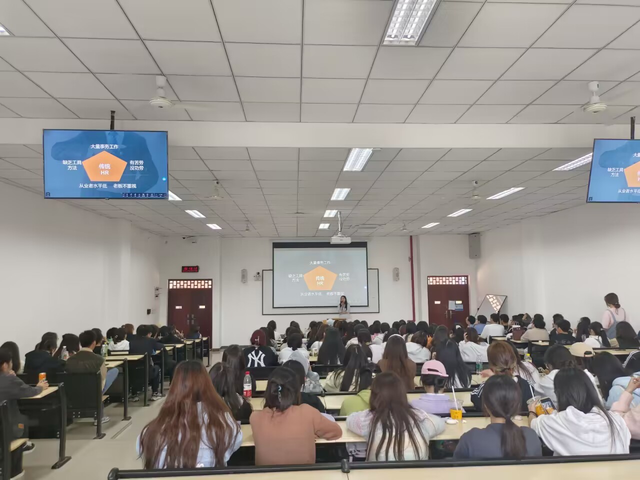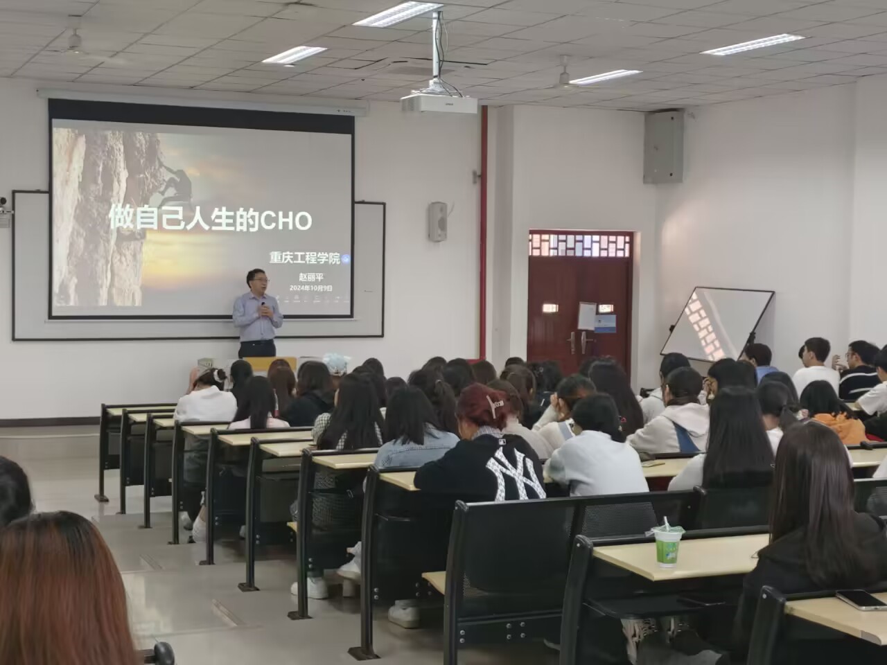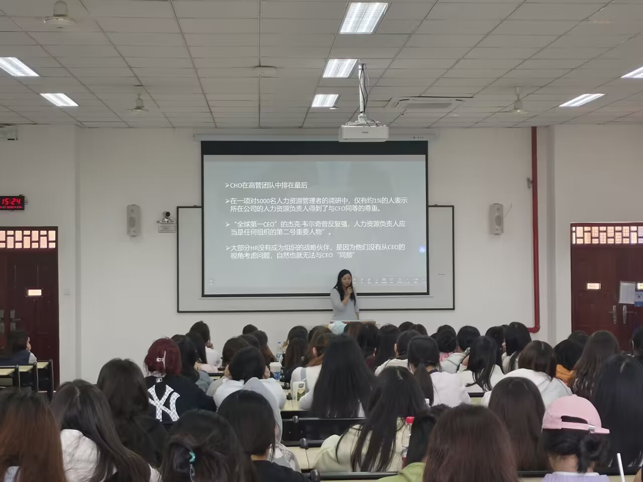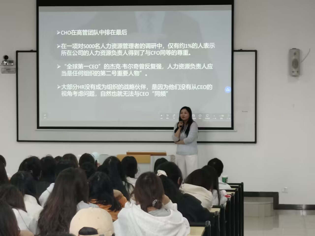 本次活动现场签到后由主持人负责介绍活动及讲师;讲师赵丽平进行“做自己人生的CHO”的讲座。活动中,讲师通过讲述HR现状,就业现状,告知我们如何突破自己,深入剖析了当前HR行业的现状与挑战,就业市场的激烈竞争;此外赵老师还分享了如何通过不断学习与实践,成为一个既精通人力资源专业知识,又具备战略思维和业务理解能力的优秀管理者;讲座的尾声赵老师进行了总结与致谢,并特别安排了答疑环节,耐心解答了同学们提出的各种问题,使大家对自己的职业规划有了更加清晰的认识和坚定的信心。
