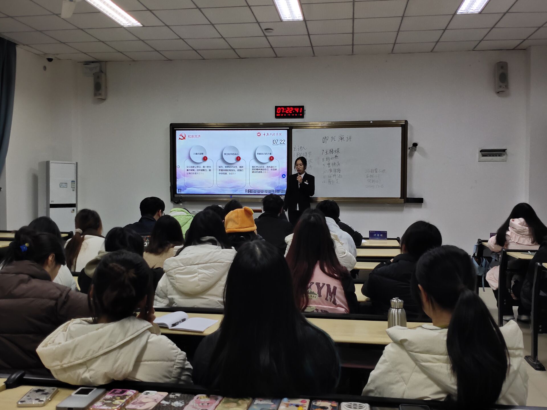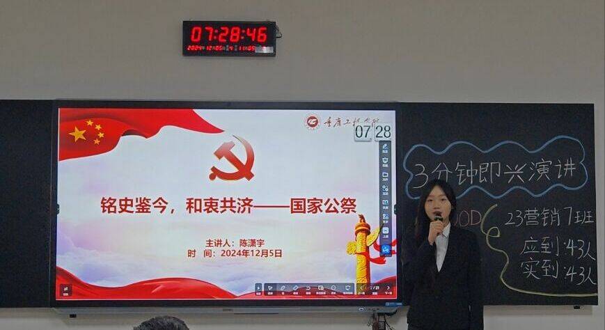 (文/左雪娇 图/黄媛媛 学生党教中心)为进一步增强同学们的历史意识和爱国情怀,继承和弘扬中国人民反对侵略、捍卫和平的坚定立场,积极传承民族精神,结合学院七培四创大学生理想信念教育方案,管理学院党总支于12月5日开展“大学生微党课”进班级活动。本次活动由七名优秀的学生发展对象走进2023级各班级,为同学们带来一场题为“铭史鉴今,和衷共济—国家公祭日”宣讲活动。