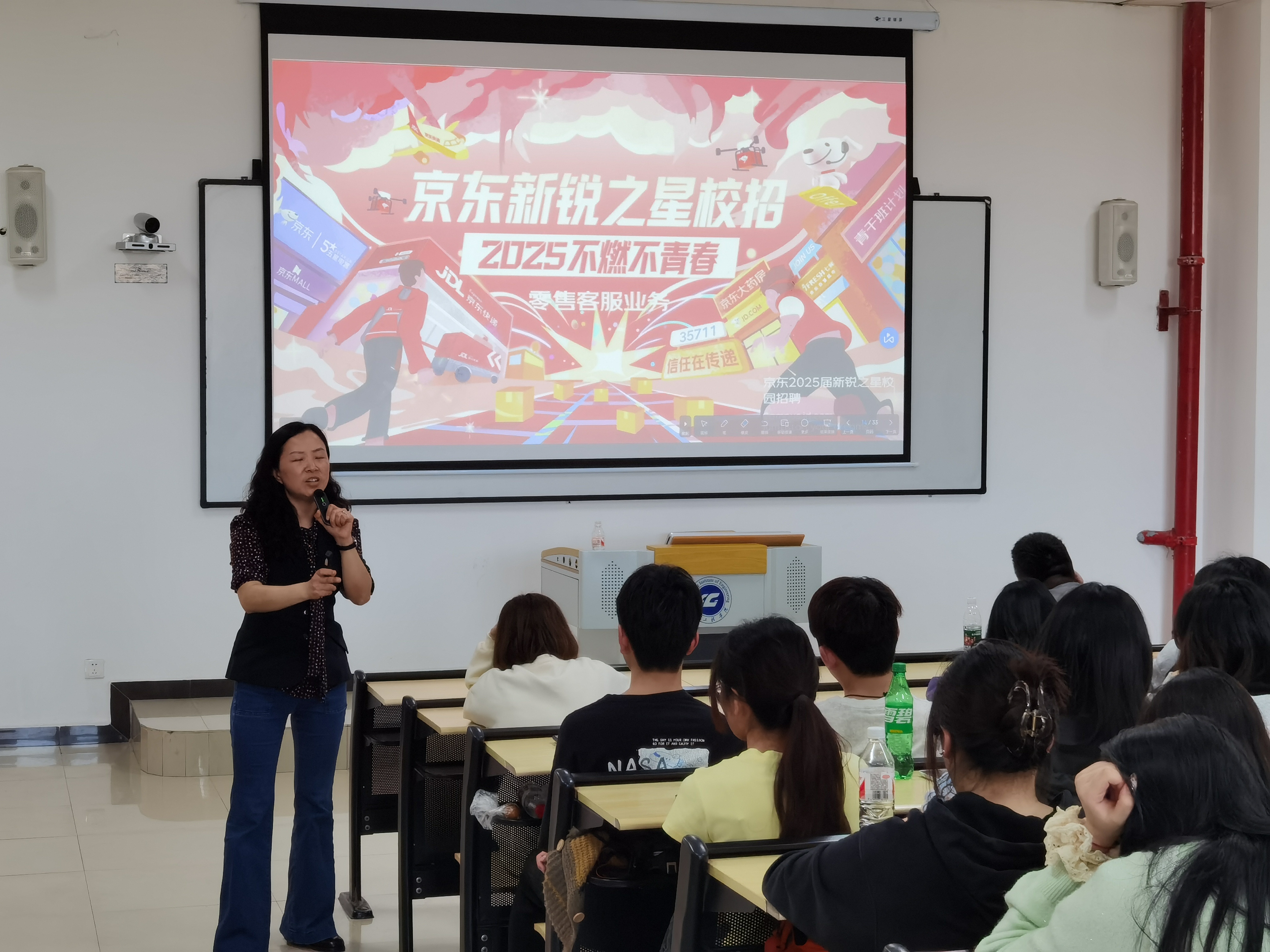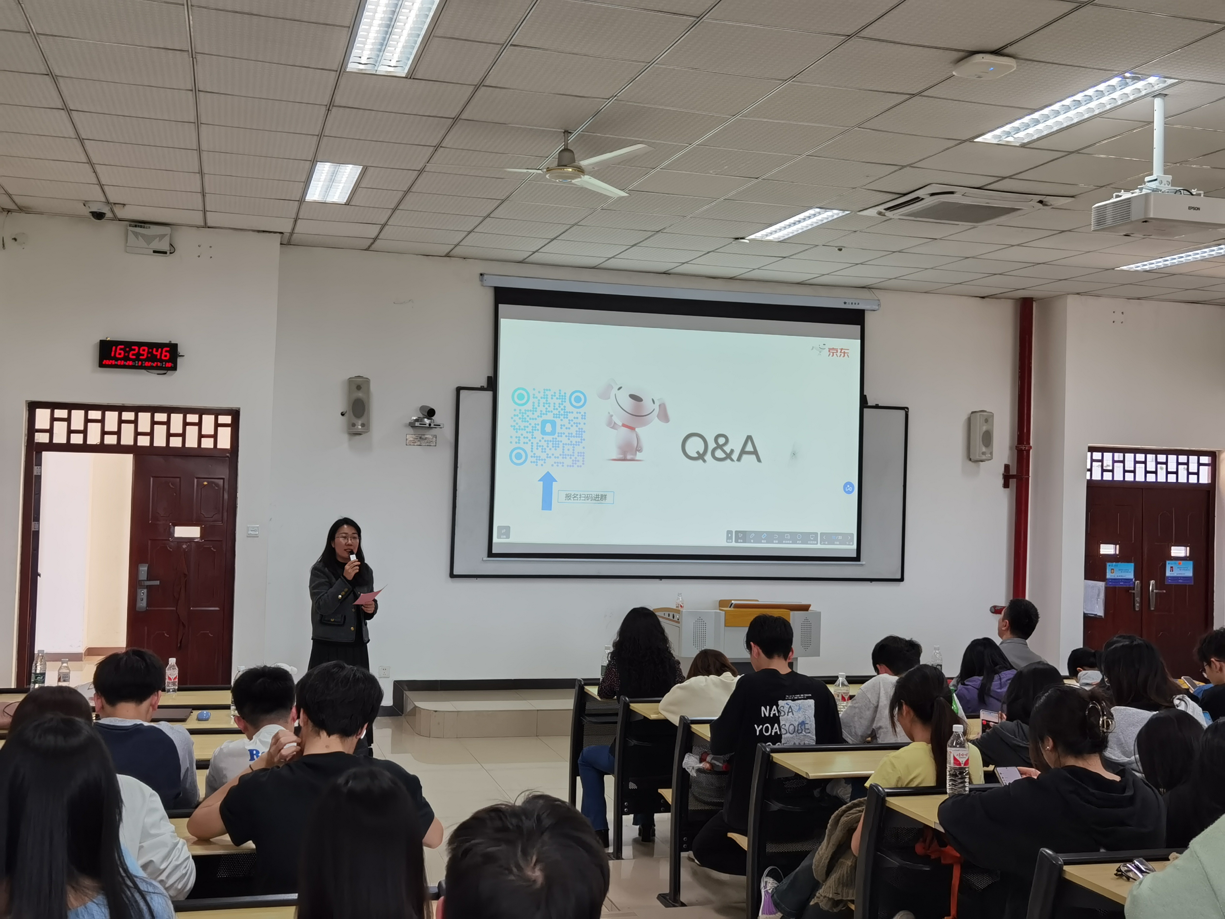 在专题宣讲环节,首先京东校企合作项目驻校负责人康乃馨介绍了京东的发展历程,企业的社会责任和未来的发展目标,并和学生进行了互动。通过康老师的介绍,学生们对京东有了更真实的认识,对进入京东工作有了些许向往。其次曾霞老师进一步详细介绍进入“京东新锐管理实验班” 的岗位职责和成长路径并对未来实验班要开展的实训时间以及工作安排进行了详细的介绍。期间曾老师用往届成功学长、学姐的例子激励大家去积极的准备面试,只有进入班级才有无限可能。针对大三学生的学业衔接问题,在答疑环节,余敏主任对未来进入班级的同学们的教学安排进行了说明,学院将采取特设班级教学模式解决。