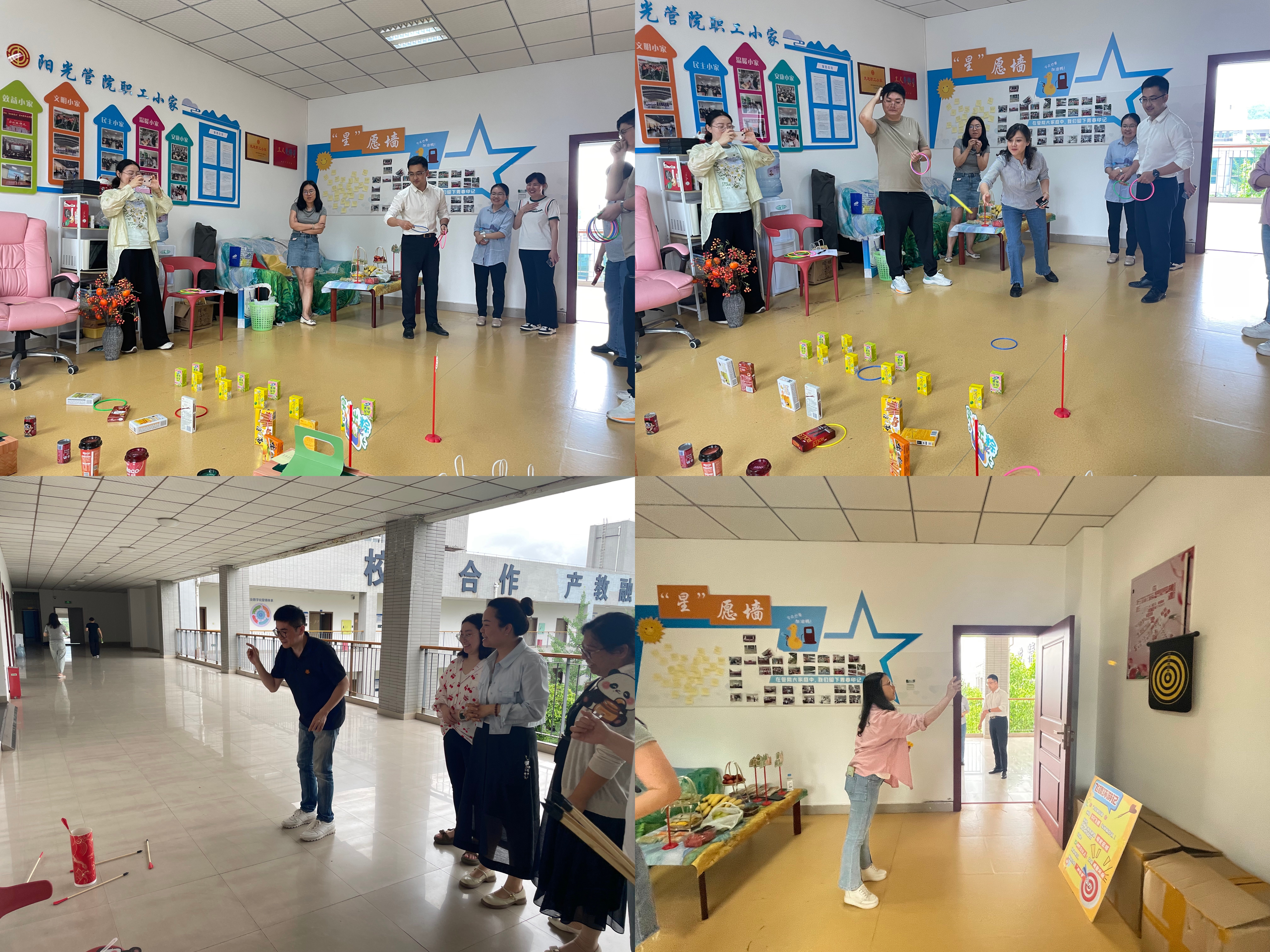 活动现场氛围热烈,充满了欢声笑语。精心设置的套圈、投标、投壶以及跳绳等趣味运动项目,将传统民俗与现代运动巧妙融合。套圈区域,老师们全神贯注,瞄准目标,抛出手中的套圈,时不时因套中目标而发出阵阵欢呼;投标环节,大家卯足干劲,力求将标投进目标区域,在比拼中展现活力;投壶项目则重现了古代文人雅士的雅趣,老师们手持箭矢,屏气凝神,体验着传统游戏的魅力;跳绳区域更是活力满满,老师们轻盈跳跃,身姿矫健,现场洋溢着热烈欢快的气氛。
