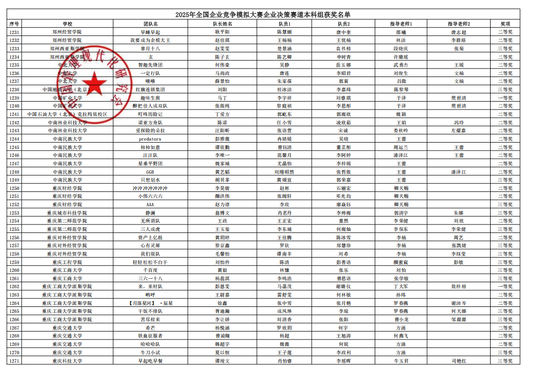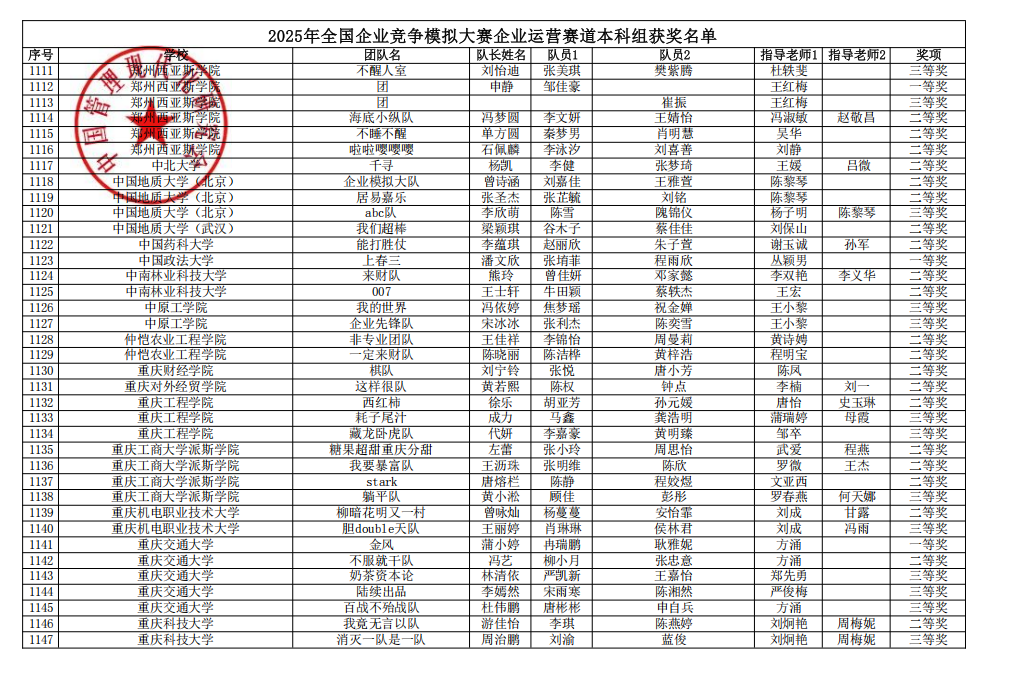 5月18日,由中国管理现代化研究会决策模拟专业委员会主办、西南财经大学承办的2025年全国企业竞争模拟大赛总决赛落幕,来自北京大学、浙江大学、武汉大学、南开大学、吉林大学和西南财经大学等高校的349支队伍开展巅峰对决。管理学院学生团队在“数智沙盘赛道”斩获全国二等奖,在“企业运营赛道”中斩获全国二等奖一项,三等奖两项,在“企业决策赛道”“供应链决策赛道”和中斩获全国三等奖。
