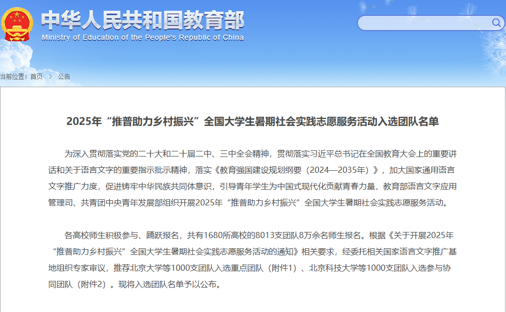 近日,教育部语言文字应用管理司、共青团中央青年发展部组织开展2025年“推普助力乡村振兴”全国大学生暑期社会实践志愿服务活动。院朱露老师指导的青年先锋宣讲团”成功入选2025年“推普助力乡村振兴”全国大学生暑期社会实践志愿服务活动协同团队。