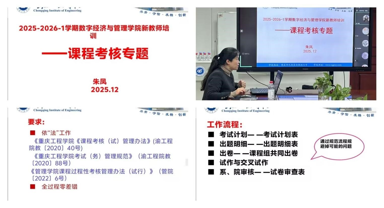 培训伊始,朱凤老师明确了新教师在课程考核工作中的三大核心任务,即出题、阅卷与成绩评定,其中出题环节需兼顾过程性考核与期末考核,确保评价体系的完整性。她着重强调,所有工作必须严格遵循"依法依规"原则,严格执行《重庆工程学院课程考核(试)管理办法》《重庆工程学院考试(务)管理规范》及《管理学院课程过程性考核管理办法(试行)》等相关文件要求,坚守"全过程零差错"的工作底线。